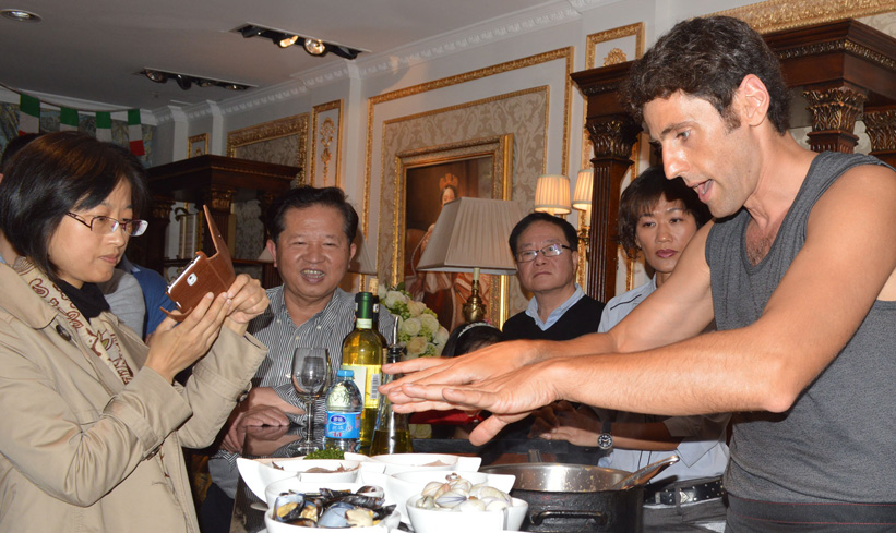 伴着《神曲》的诗歌朗诵,Massimo马希莫扮作意大利文艺复兴的先驱——但丁隆重登场。为了向创造意大利文的但丁表示敬意,Massimo马希莫带领大家玩起了意大利语言的小游戏。接着,他阐述了文艺复兴为何源自托斯卡纳的翡冷翠,即佛罗伦萨,以及托斯卡纳辉煌璀璨的雕塑、建筑、音乐、装饰风格等文化艺术。Massimo马希莫还详细介绍到了托斯卡纳如何吃喝玩乐才最地道、最过瘾。最后,他还亲手烹制了托斯卡纳经典的料理Cacciucco,并传授给大家品鉴葡萄酒的诀窍。