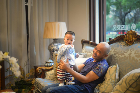 爸爸和孩子带着融情的蜜意看着沉浸在幸福花海当中的妈妈,在不经意间笑靥如花。