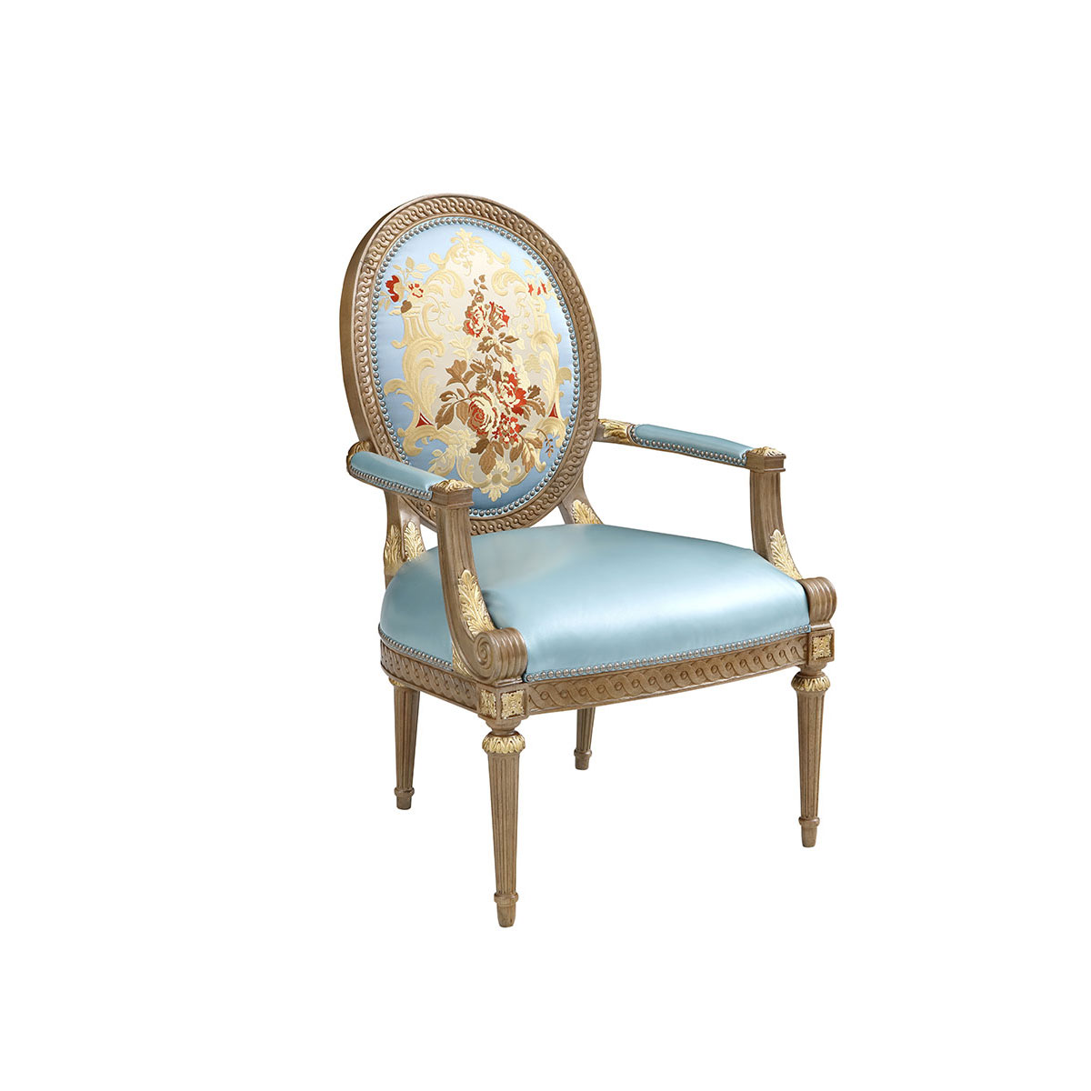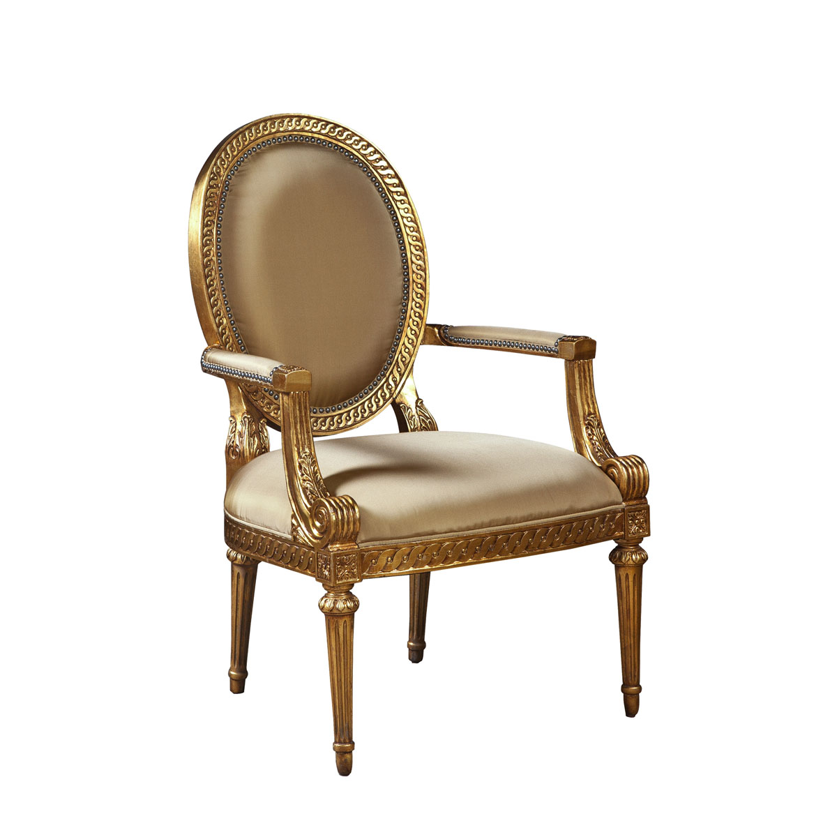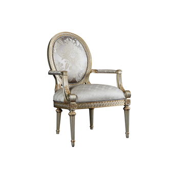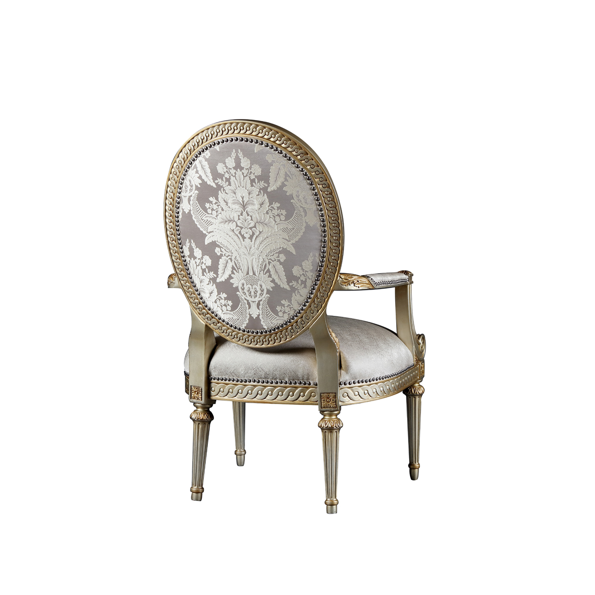 这款休闲椅是参考18世纪法国路易十六时期涂金扶手椅古董设计,并结合同时期的圆面背板设计。配上精致的连续雕刻、锥形脚设计、触感舒适的布艺和包有丰厚的填充物坐垫和靠背。