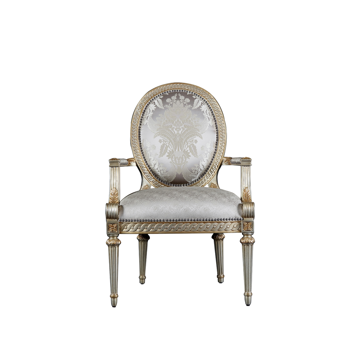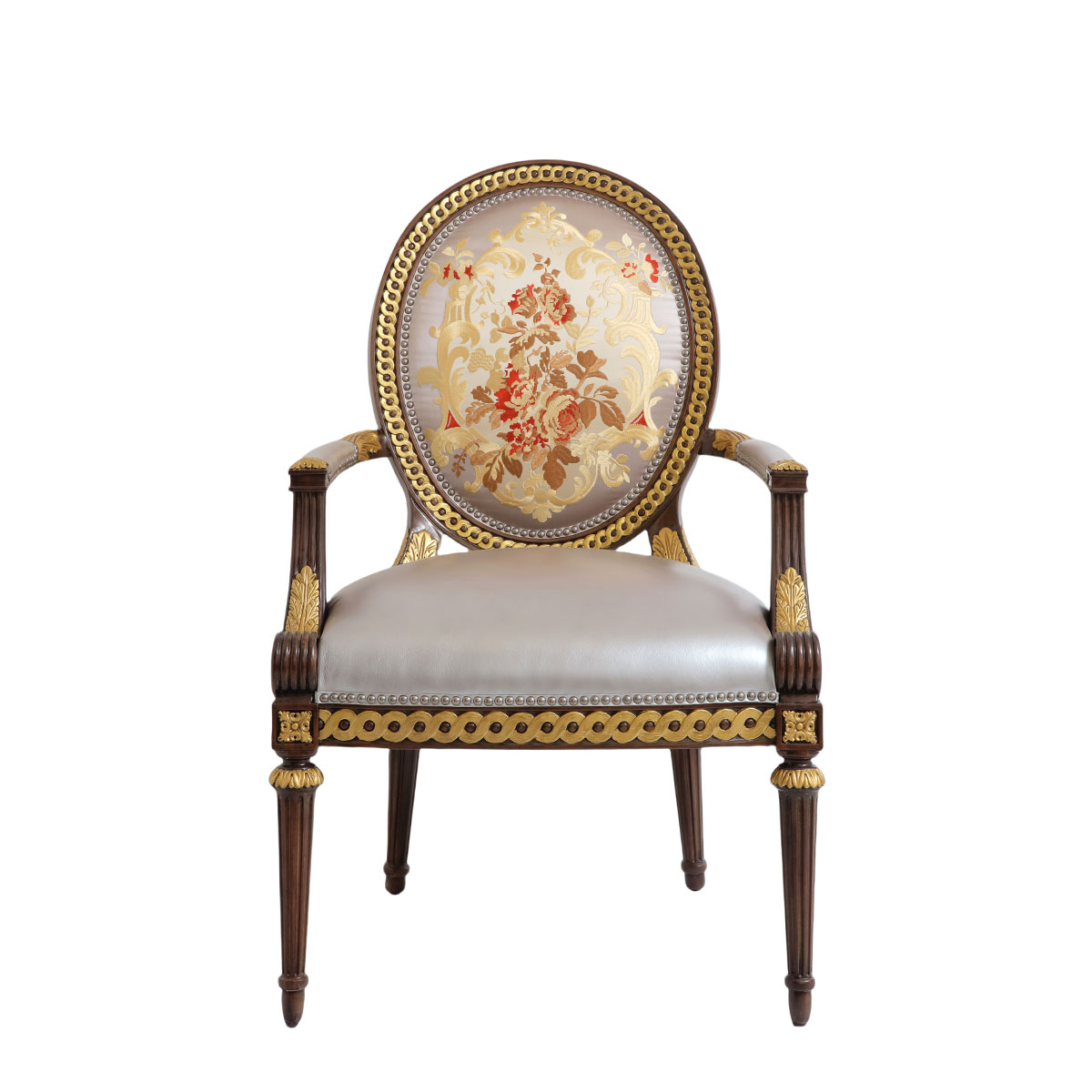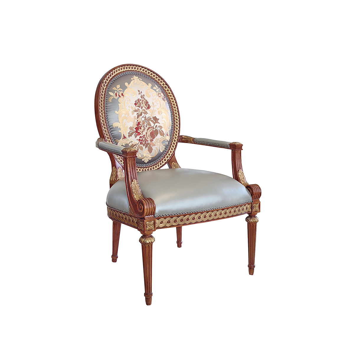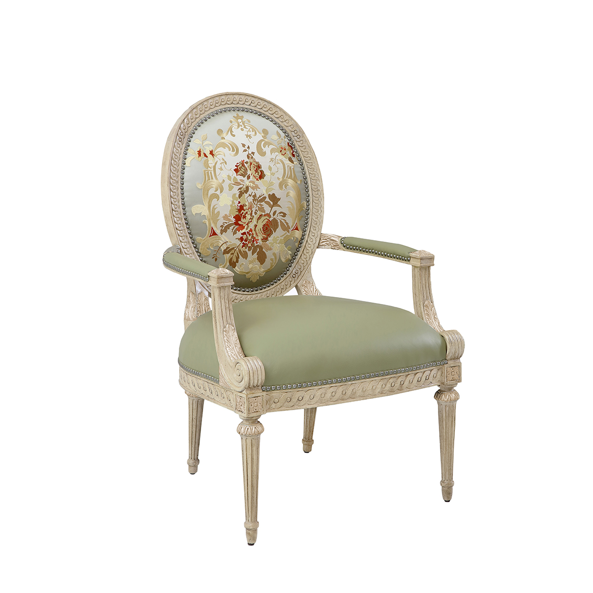 这款休闲椅是参考18世纪法国路易十六时期涂金扶手椅古董设计,并结合同时期的圆面背板设计。配上精致的连续雕刻、锥形脚设计、触感舒适的布艺和包有丰厚的填充物坐垫和靠背。