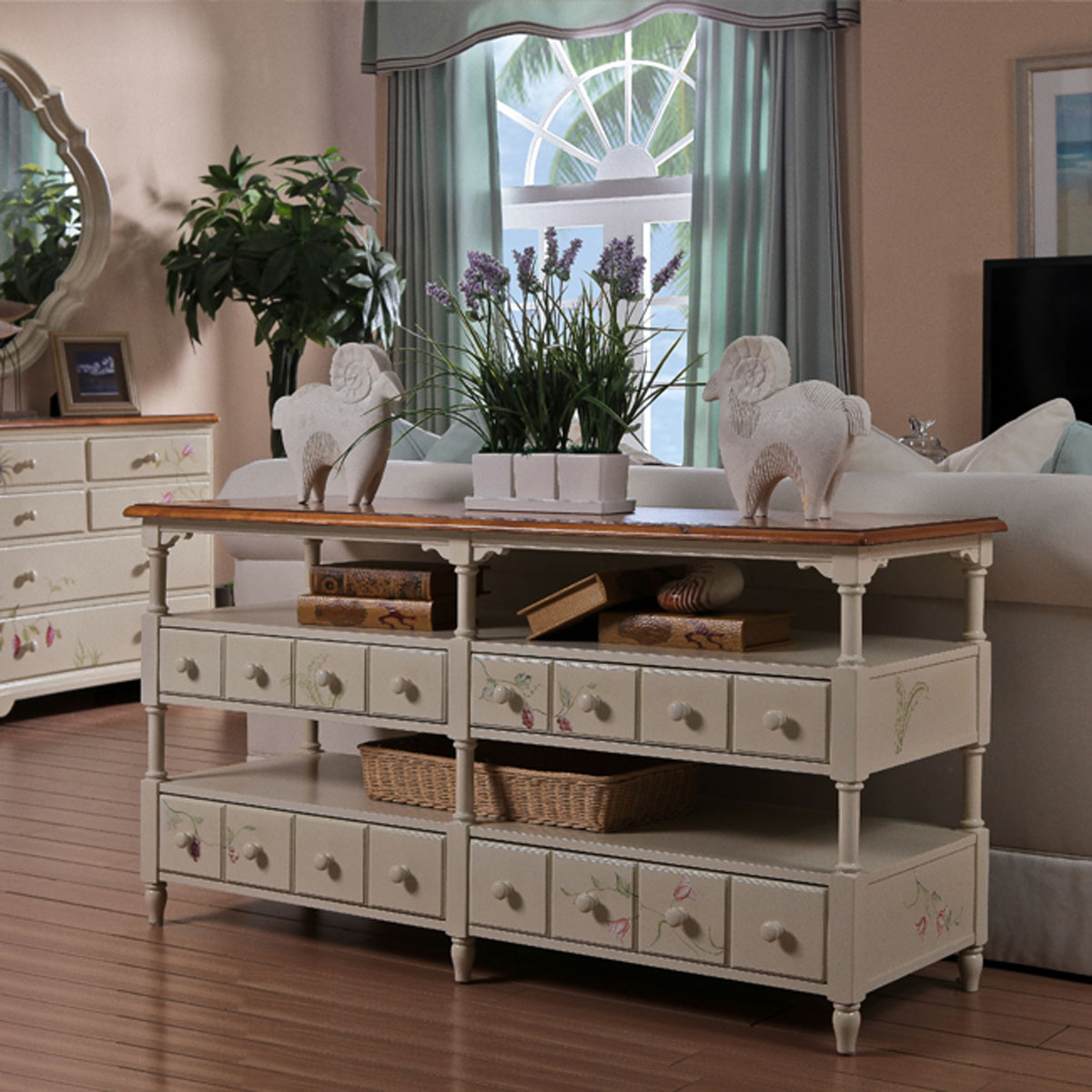 * 这是“小空间的妙设计”,开空式设计方便放置饰品或日常用品,而各层多斗面的抽屉亦增强了收纳与美观功能;素雅的彩绘,竹节造型的雕刻柱和锥形车轵脚,使其充分展现了艺术美感,带来度假休闲的美好时光。