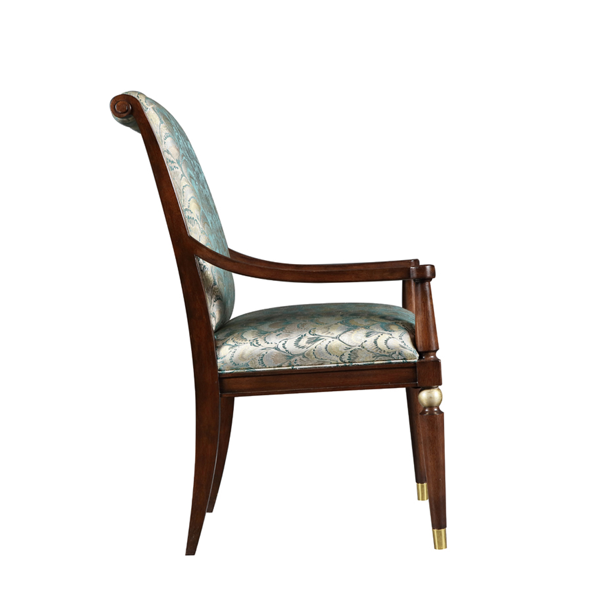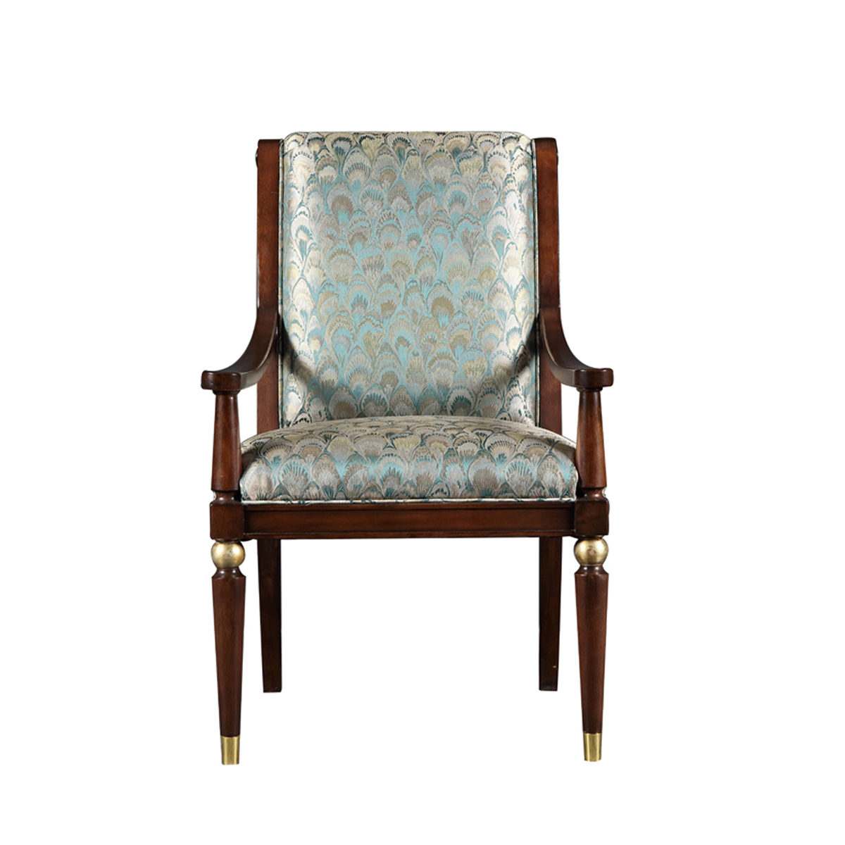 胡桃木色框架深浅明暗度的对比,更具有立体感,清晰的胡桃木纹理和孔雀翎印花布艺体现出大自然的感觉。