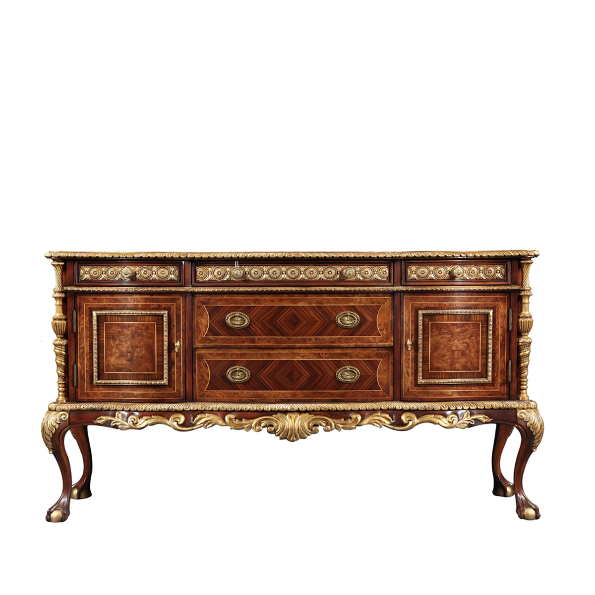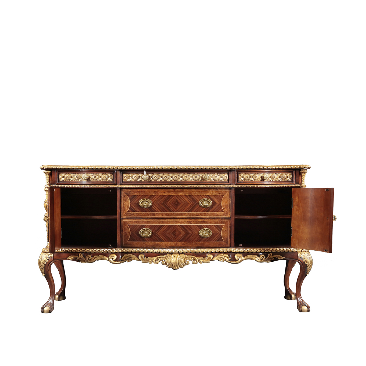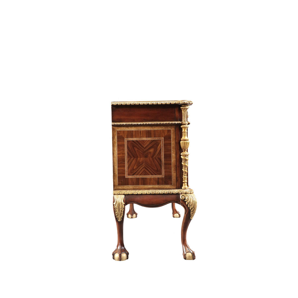 设计师从英国温莎城堡中汲取设计灵感,灵动的裙摆轮廓勾画庄严古雅的造型,采用材质细腻而质地优良的桃花心木作基材,流畅的S曲线及爪球脚和层次丰富而纹理清晰的木皮拼花在墨绿色的斑驳古迹中释放千年古韵。