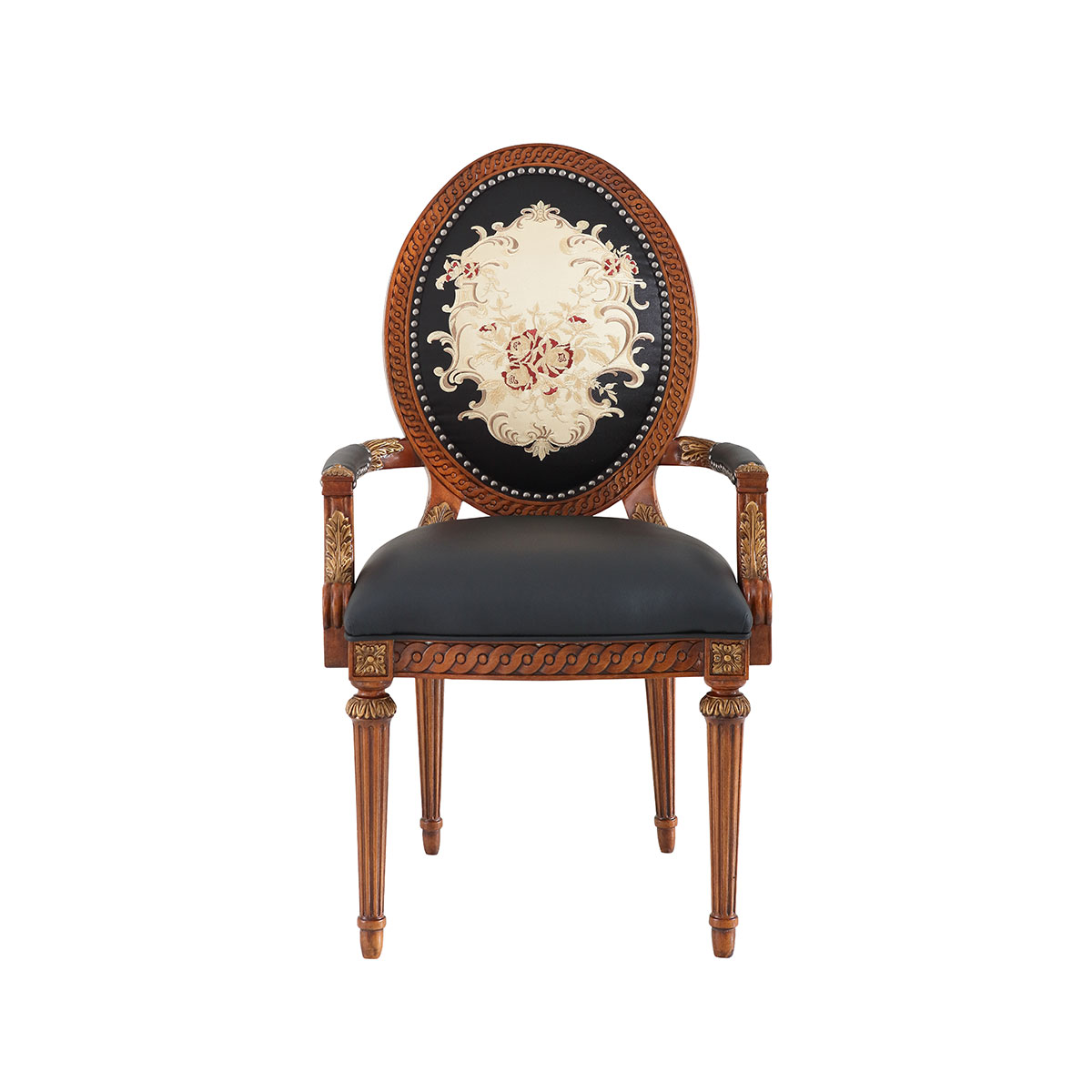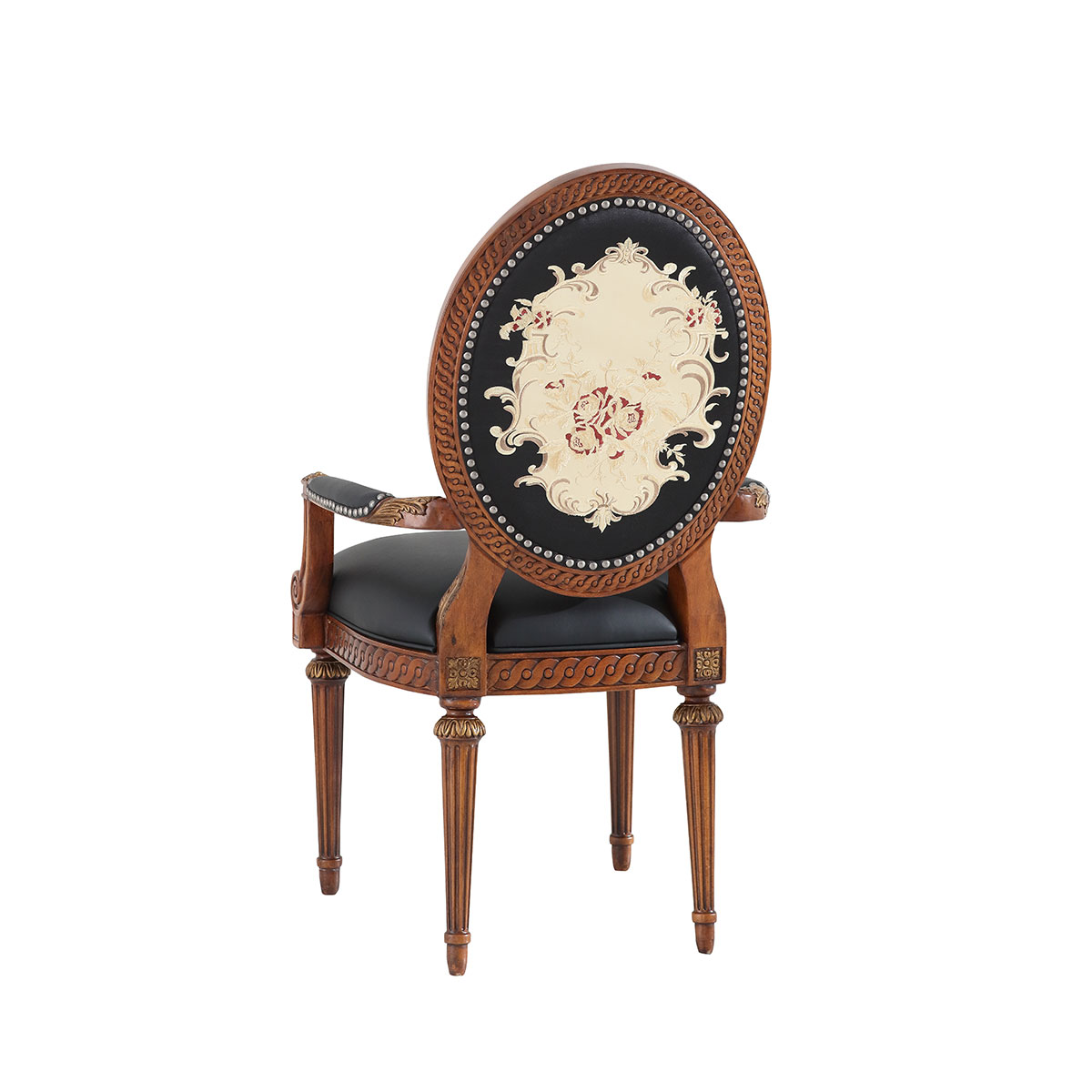参考18世纪法国路易十六时期涂金扶手椅古董设计,并结合同时期的圆面背板设计。配上精致的连续雕刻和贴金铂工艺、锥形脚设计、触感舒适的布艺和包有丰厚的填充物坐垫和靠背。