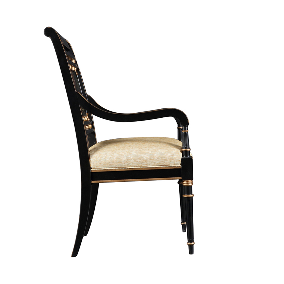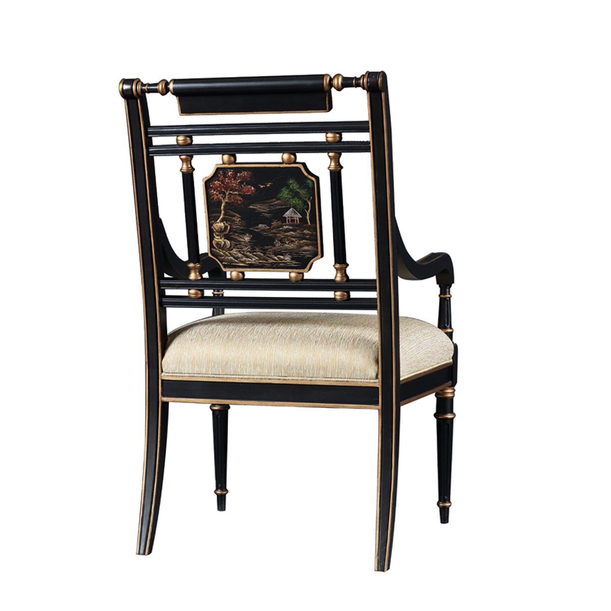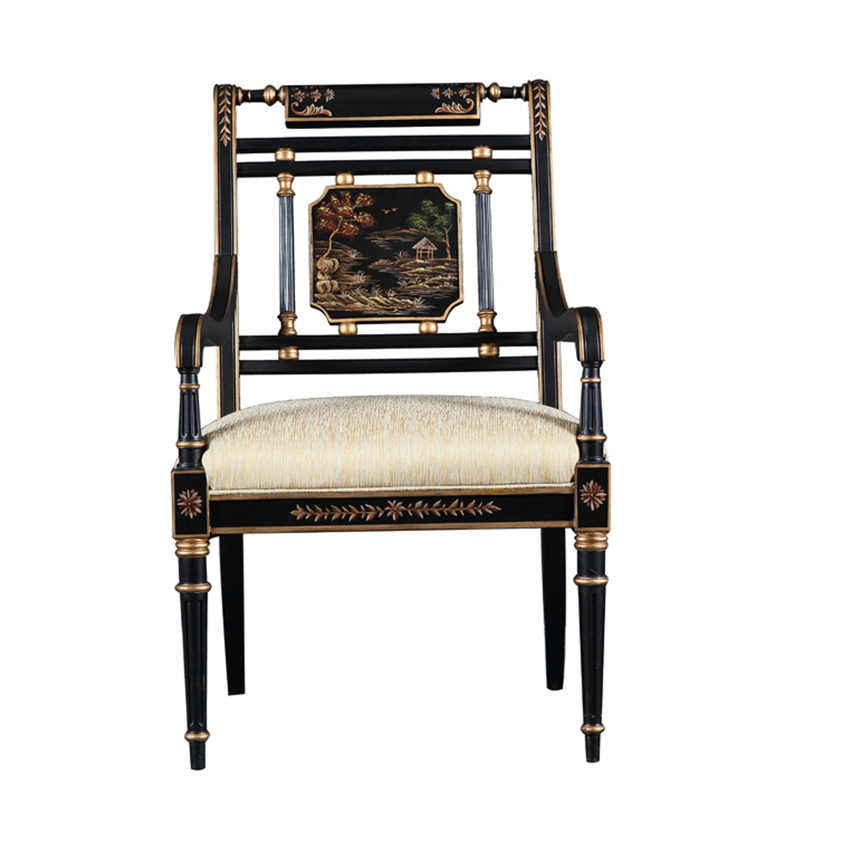 黑铮发亮的球盟会(中国)·网页登录上描以金黄色的山水图画,婉然挂着一幅名家的山水画。配合极具英式文化精髓的谢拉顿椅脚及镂空造型,让整个空间协调,充分展示了中西家居文化相互糅合的设计创意。