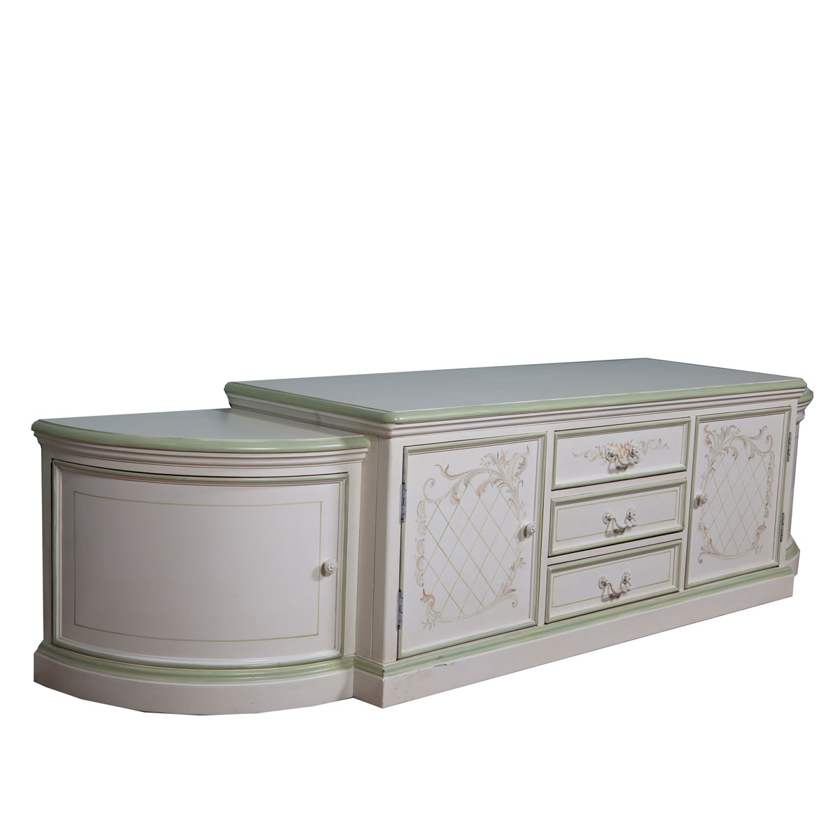 * 手工拼花更显艺术价值,左右合拼制成半月形状 * 门内各有一块可调层板 * 三个储物抽斗,底部采用硬木实木滑轨 * 脚底部装有可调整脚钉.