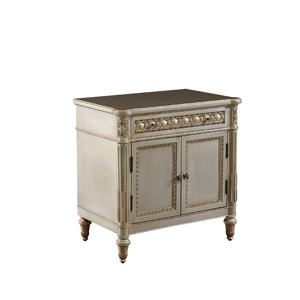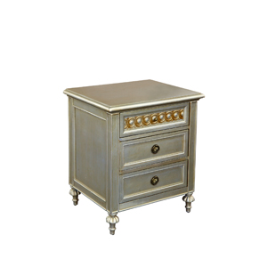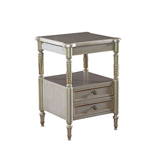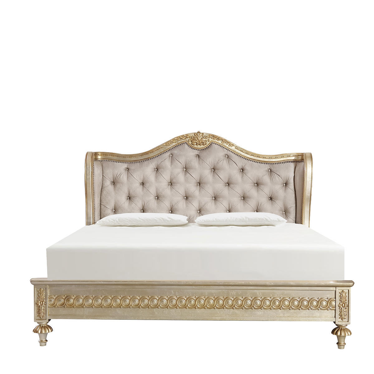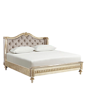 设计灵感源自法国浪漫奢华的凡尔赛宫,采用路易十四时期的太阳花连环雕刻和宛如翅膀扩展形状的床头板设计,配以实木花环和卷叶雕刻,表现凡尔赛宫的庄严;米黄色温和的色调选择,在庄严中带来丝丝浪漫之意。