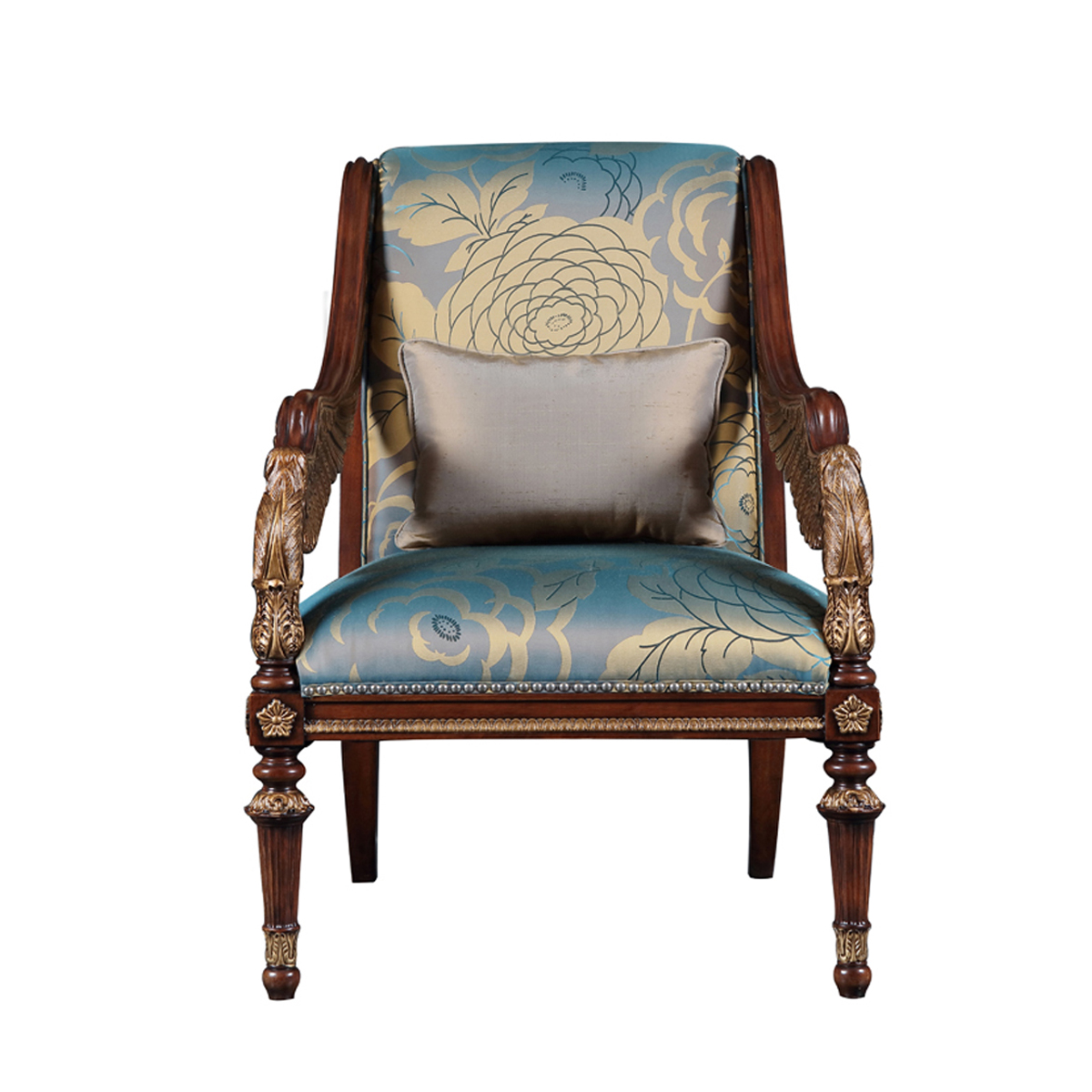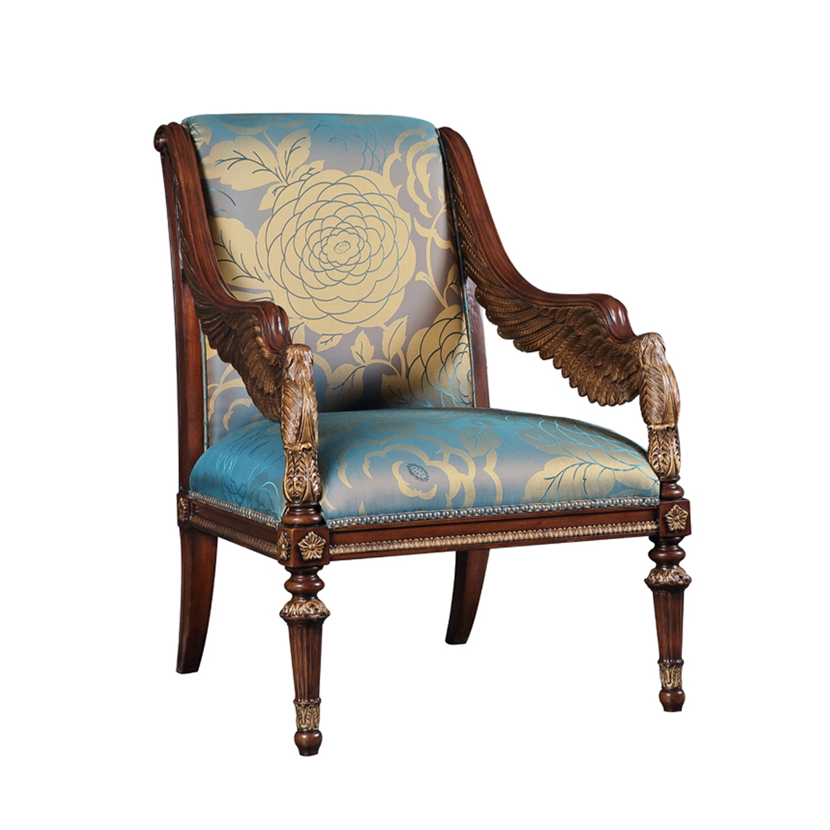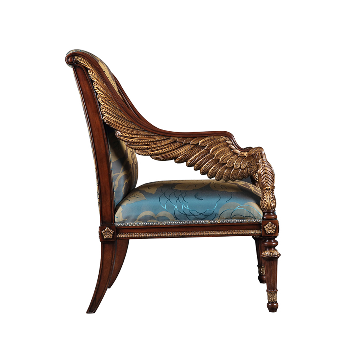 以现保存在法国"卢浮宫"的 “胜利女神像”为意念,并结合意大利强调帝权象征的帝国EMPIRE风格元素中翅膀造型,设计雕刻出胜利女神-Samothrace翅膀扶手,羽翼丰满的羽毛雕刻极为精巧经典,栩栩如生,复兴你的典雅情怀。