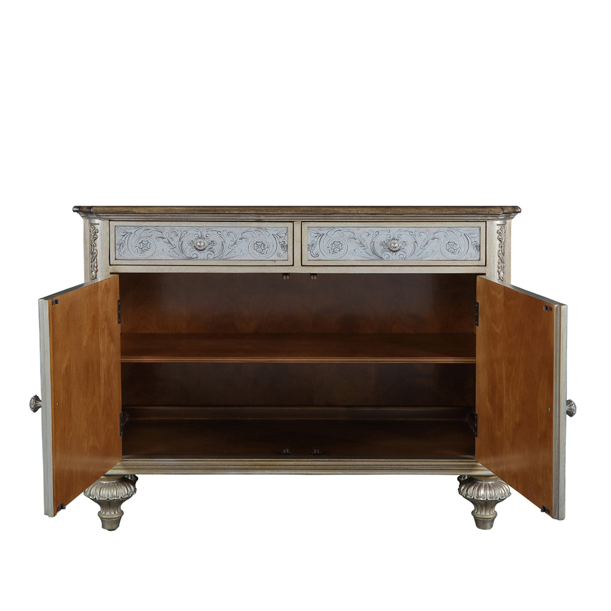 * 手工雕刻的工艺细节结实的连接技术18道以上的多步骤油漆工艺; * 2个储物抽斗,采用经典的硬木实木滑轨设计; * 门内有1块实木层板; * 底部装有可调脚钉;