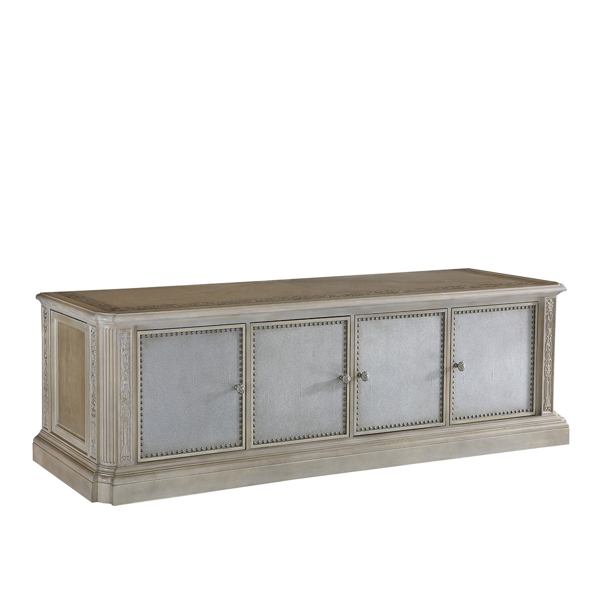 玻璃为画板,银箔压花,在复古彩绘色调中倾注人性情感,原本单调的美便生动了起来。栩栩如生的花纹图案带来幸福的福音,彰显顽强的生命力量;沉稳端庄的电视柜遵循着对称的法则。