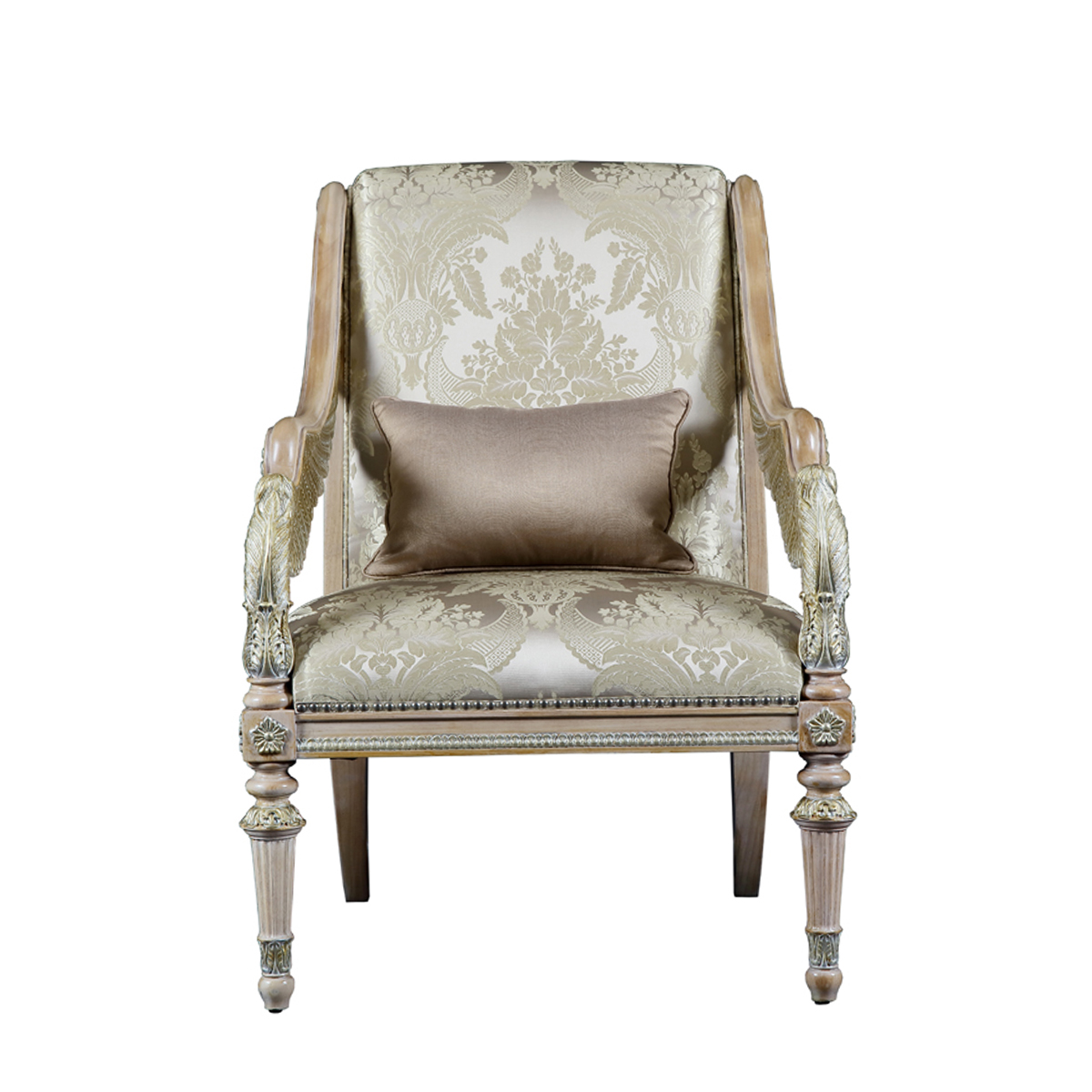 以现保存在法国"卢浮宫"的 “胜利女神像”为意念,并结合意大利强调帝权象征的帝国EMPIRE风格元素中翅膀造型,设计雕刻出胜利女神-Samothrace翅膀扶手,羽翼丰满的羽毛雕刻极为精巧经典,栩栩如生,复兴你的典雅情怀。