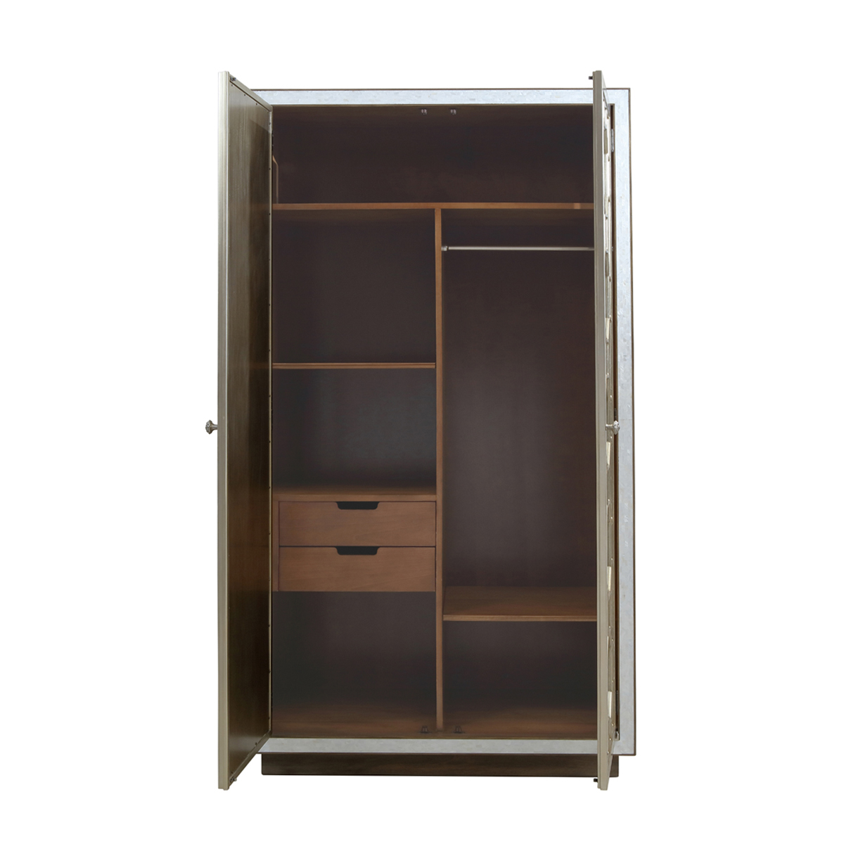 * 门内有二块可调节高度的层板;层板下有一排可活动的西裤架和领带架; * 顶部装有二根可拆装的挂衣棒; * 二个小抽斗,底部装有硬木实木滑轨; * 底部装有四个调整脚钉;