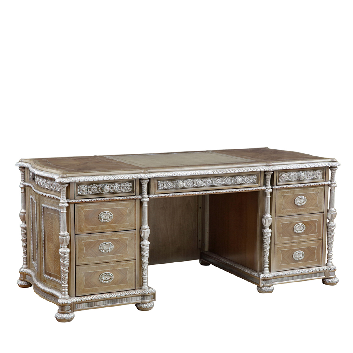 * 写字台上中部分为左右上斗,抽斗两边装有2条三节消声铁滑轨,滑顺耐用,斗内装有文档挂条,中下斗配带锁储物抽斗或文件斗; * 左右下斗为两个斗看似为两个抽斗形状的大档斗或文件斗; * 办公桌前面中央为开空的存放空间,一块木制层板,放便存取书籍; * 写字台底部装有大号可调整脚钉