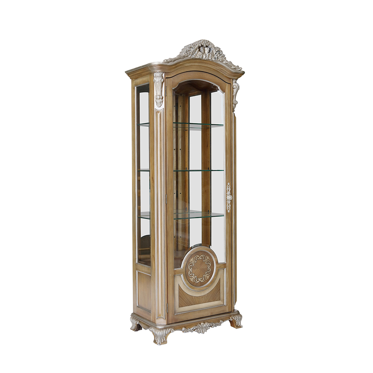 * 精致的手工雕刻细节 * 实木框玻璃门,门内有三块玻璃层板; * 底部装有可调层板;