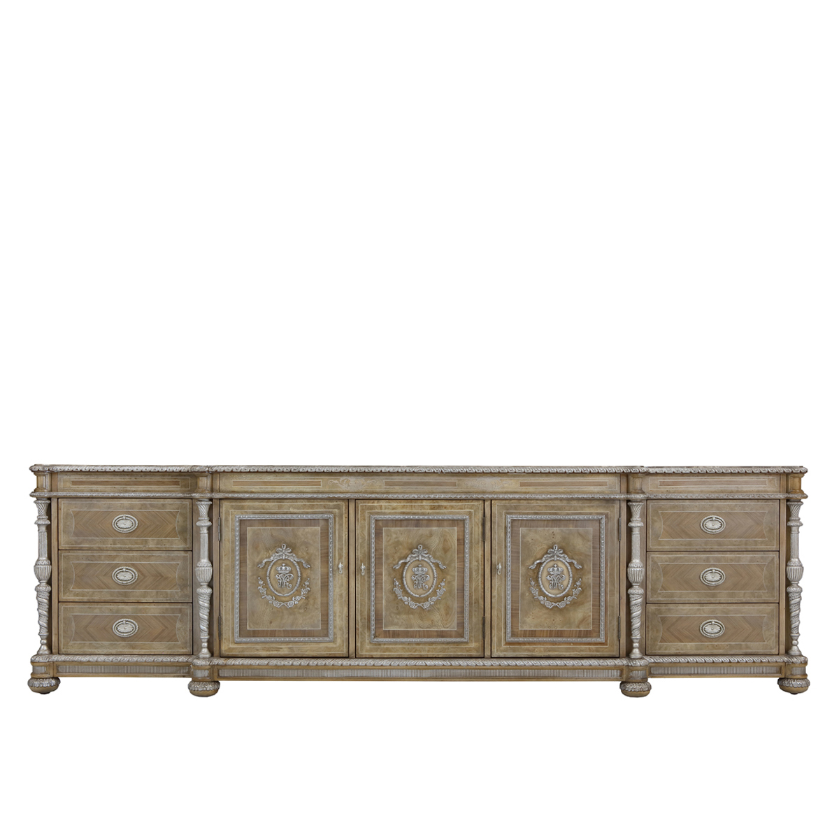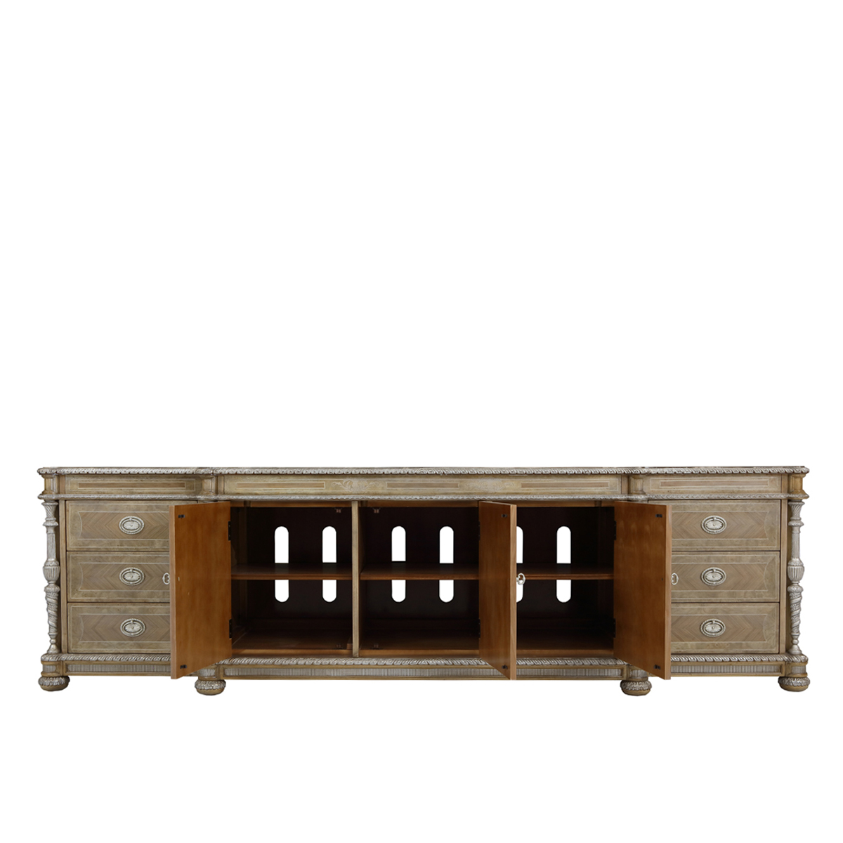 * 手工木皮拼贴工艺结实的连接技术18道以上的多步骤油漆工艺; * 六个储物抽斗,底部采用实木硬木滑轨; * 三扇实木门,门内各有一块活动层板;