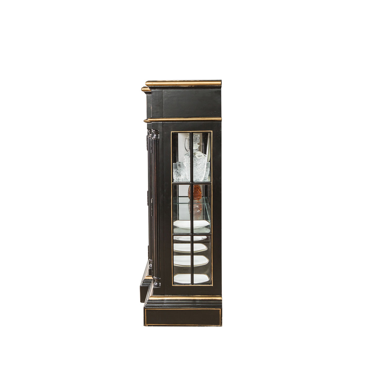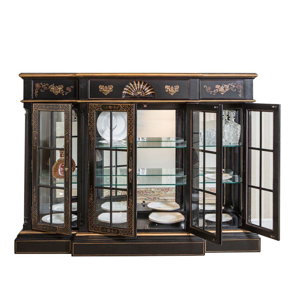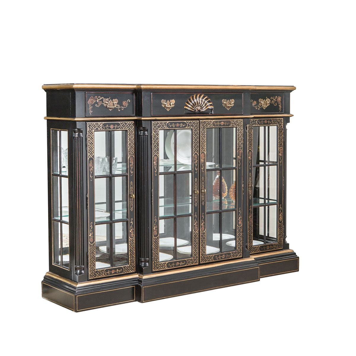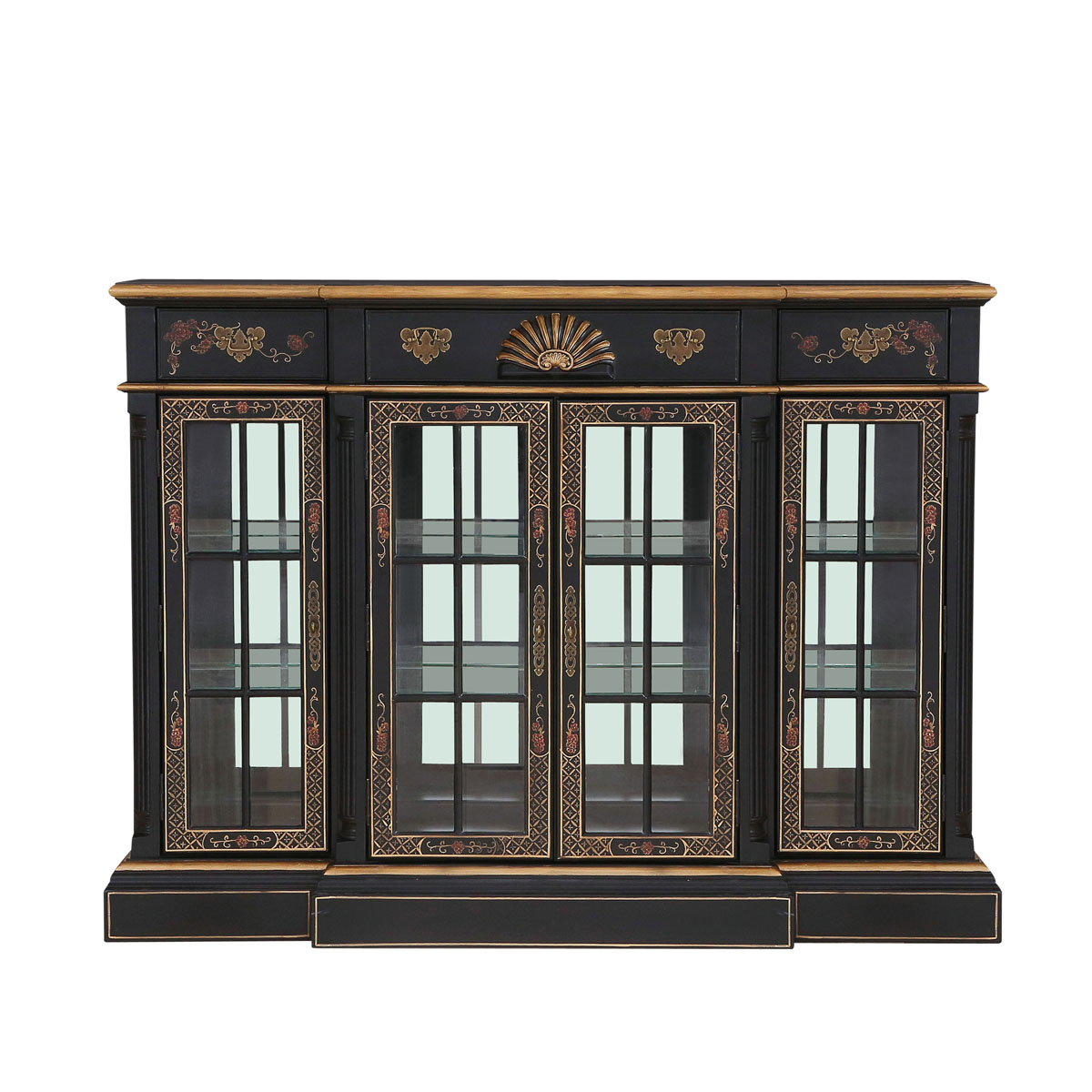 * 手工雕刻的工艺细节结实的连接技术18道以上的多步骤油漆工艺 * 三个储物抽斗,底部采用经典硬木实木滑轨设计 * 门内各有2块可调木框玻璃层板;背板处装有背镜,使柜身内部的光线更通亮;