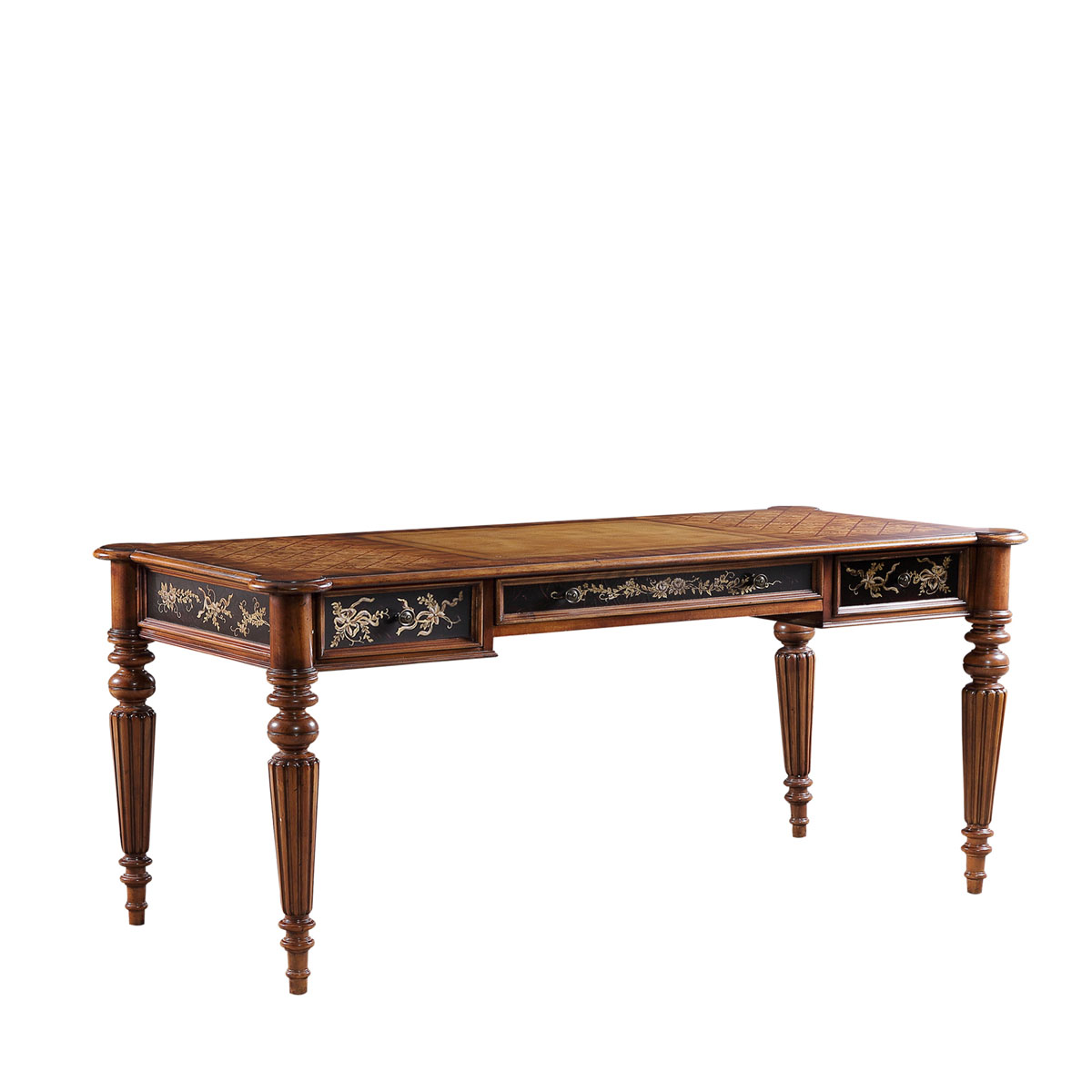 * 以18世纪英吉利——“日不落帝国”为设计主题,将东西方的多种艺术元素结合在一起。精致的木皮贴面,展现了高档木材的天然纹理,带出独特的立体感;黑底金漆的山水手绘,颇具东方情调。配上Sheraton(谢拉顿风格)的锥形凹槽柱和层板设计,是经典系列英吉利经典英式长方咖啡桌的特色。