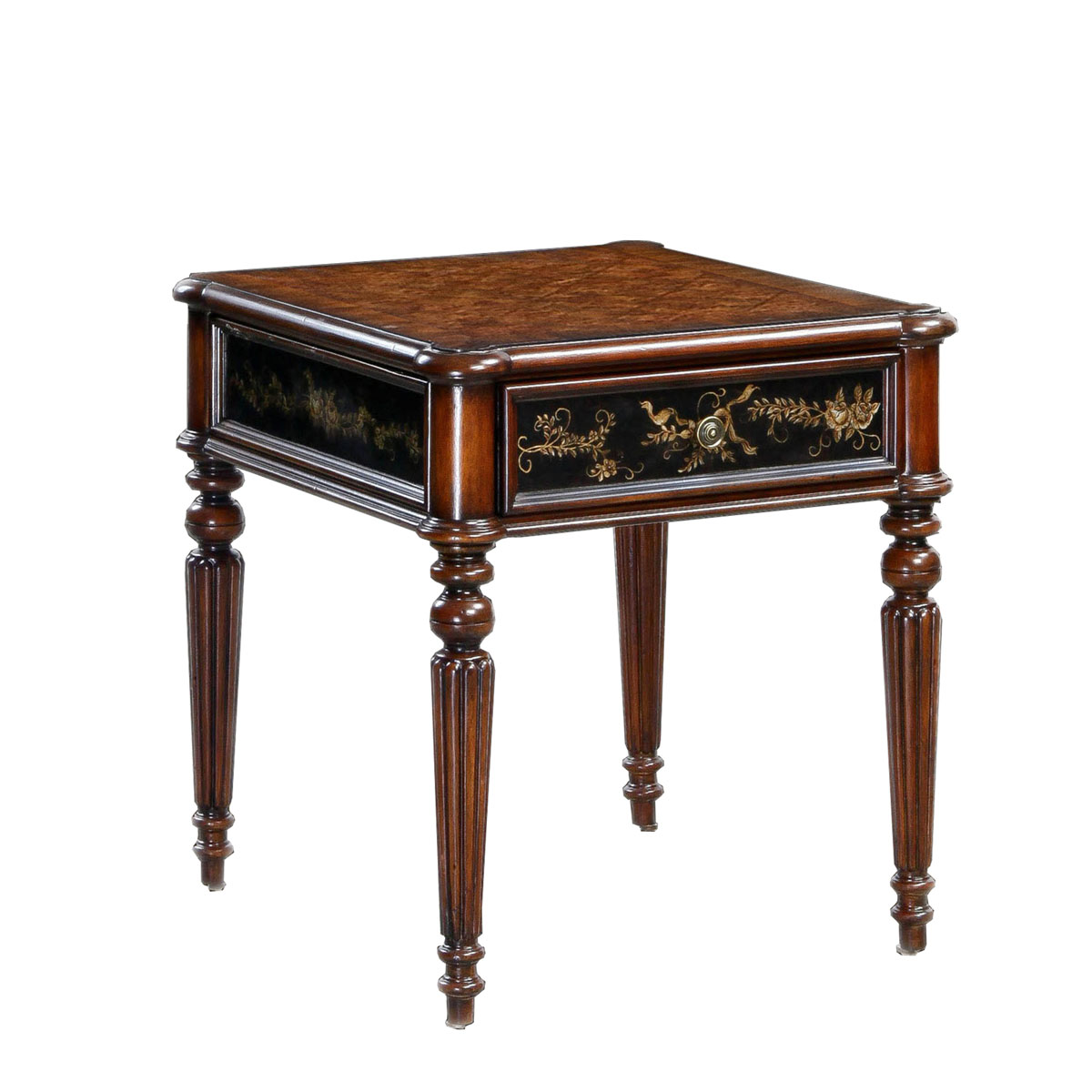 * 以18世纪英吉利——“日不落帝国”为设计主题,将东西方的多种艺术元素结合在一起。精致的木皮贴面,展现了高档木材的天然纹理,带出独特的立体感;黑底金漆的山水手绘,颇具东方情调。配上Sheraton(谢拉顿风格)的锥形凹槽柱和层板设计,是经典系列英吉利经典英式长方灯台的特色。