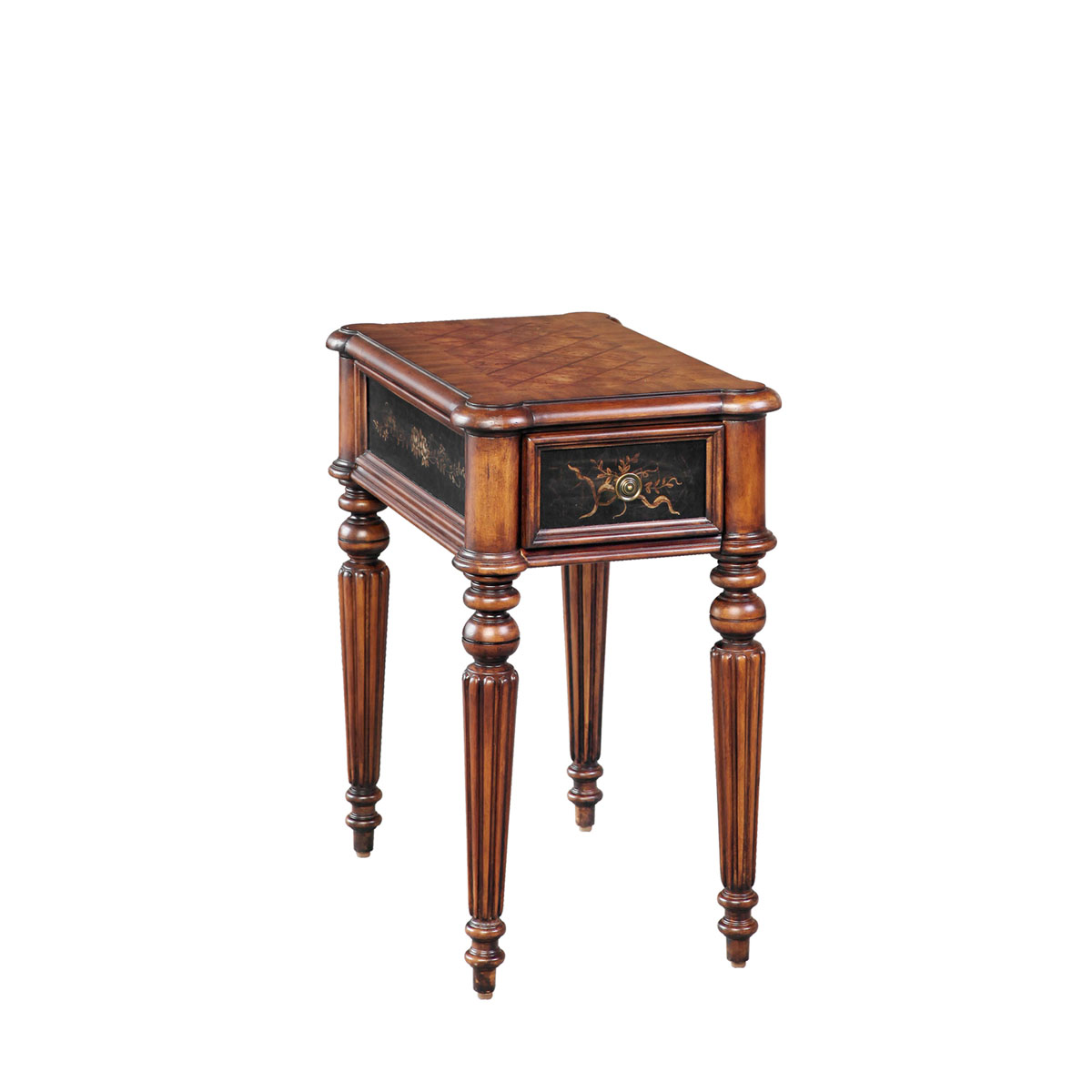 * 以18世纪英吉利——“日不落帝国”为设计主题,将东西方的多种艺术元素结合在一起。精致的木皮贴面,展现了高档木材的天然纹理,带出独特的立体感;黑底金漆的山水手绘,颇具东方情调。配上Sheraton(谢拉顿风格)的锥形凹槽柱和层板设计,是经典系列英吉利经典英式长方咖啡桌的特色。