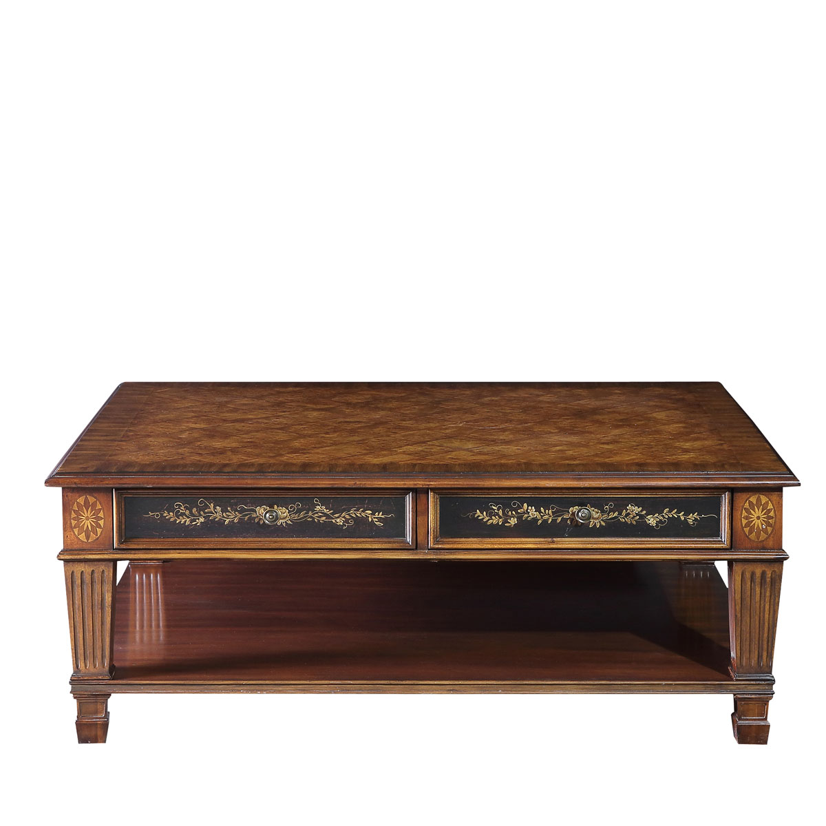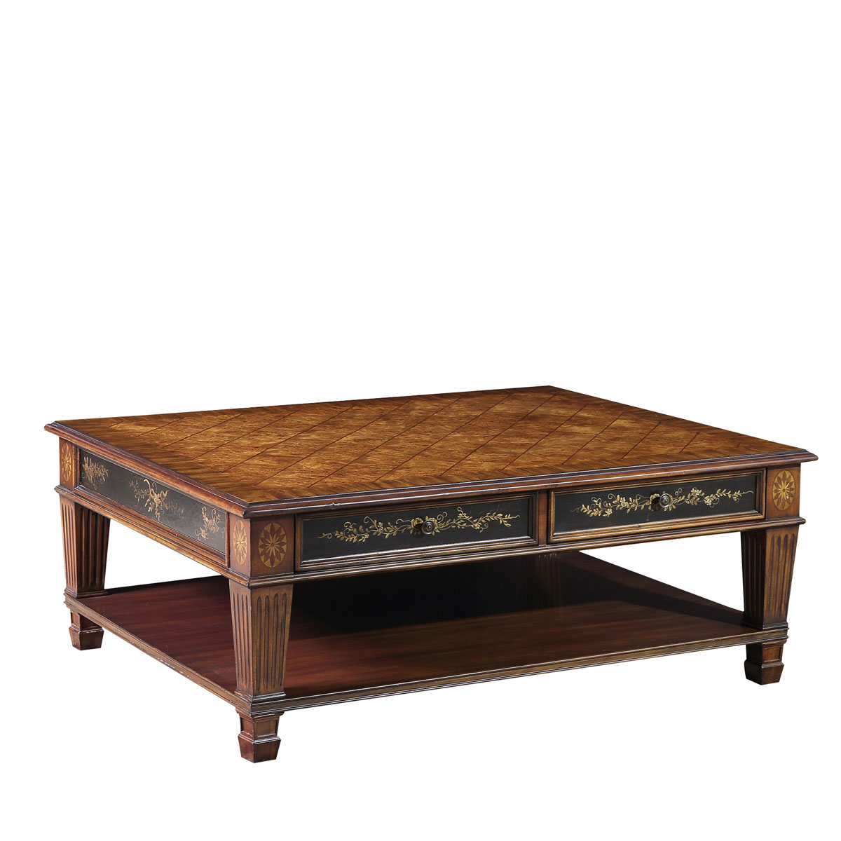 * 以18世纪英吉利——“日不落帝国”为设计主题,将东西方的多种艺术元素结合在一起。精致的木皮贴面,展现了高档木材的天然纹理,带出独特的立体感;黑底金漆的山水手绘,颇具东方情调。配上Sheraton(谢拉顿风格)的锥形凹槽柱和层板设计,是经典系列英吉利经典英式长方咖啡桌的特色。