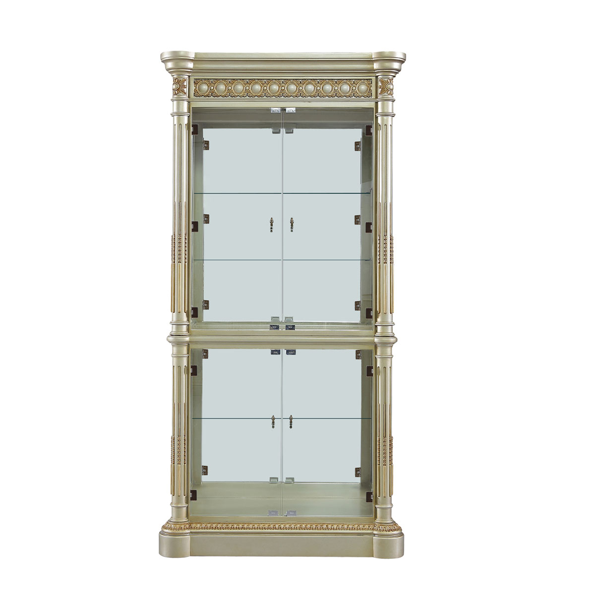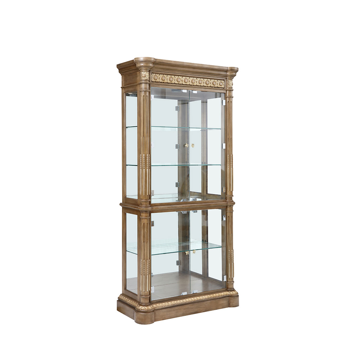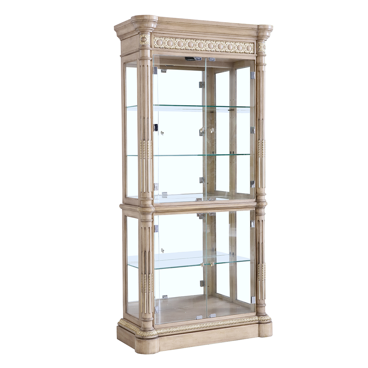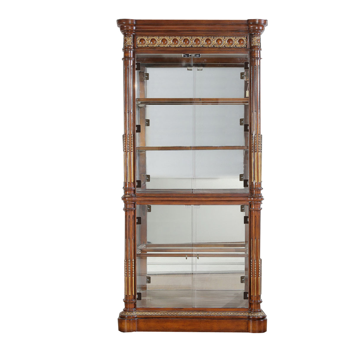 * 手工雕刻的工艺细节, 结实的连接技术; * 共三块可调整玻璃层板和瓷器展示功能的沟槽,上层有装饰灯和触摸式开关;背板处装有背镜,使柜身内部的光线更通亮;