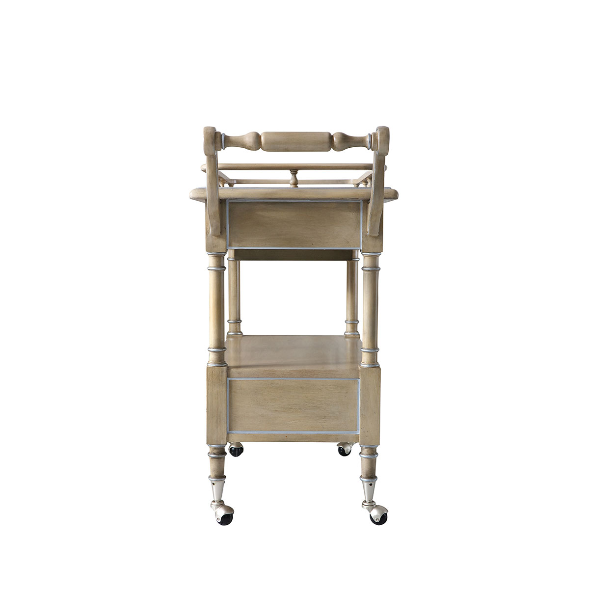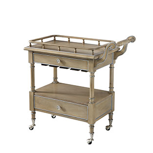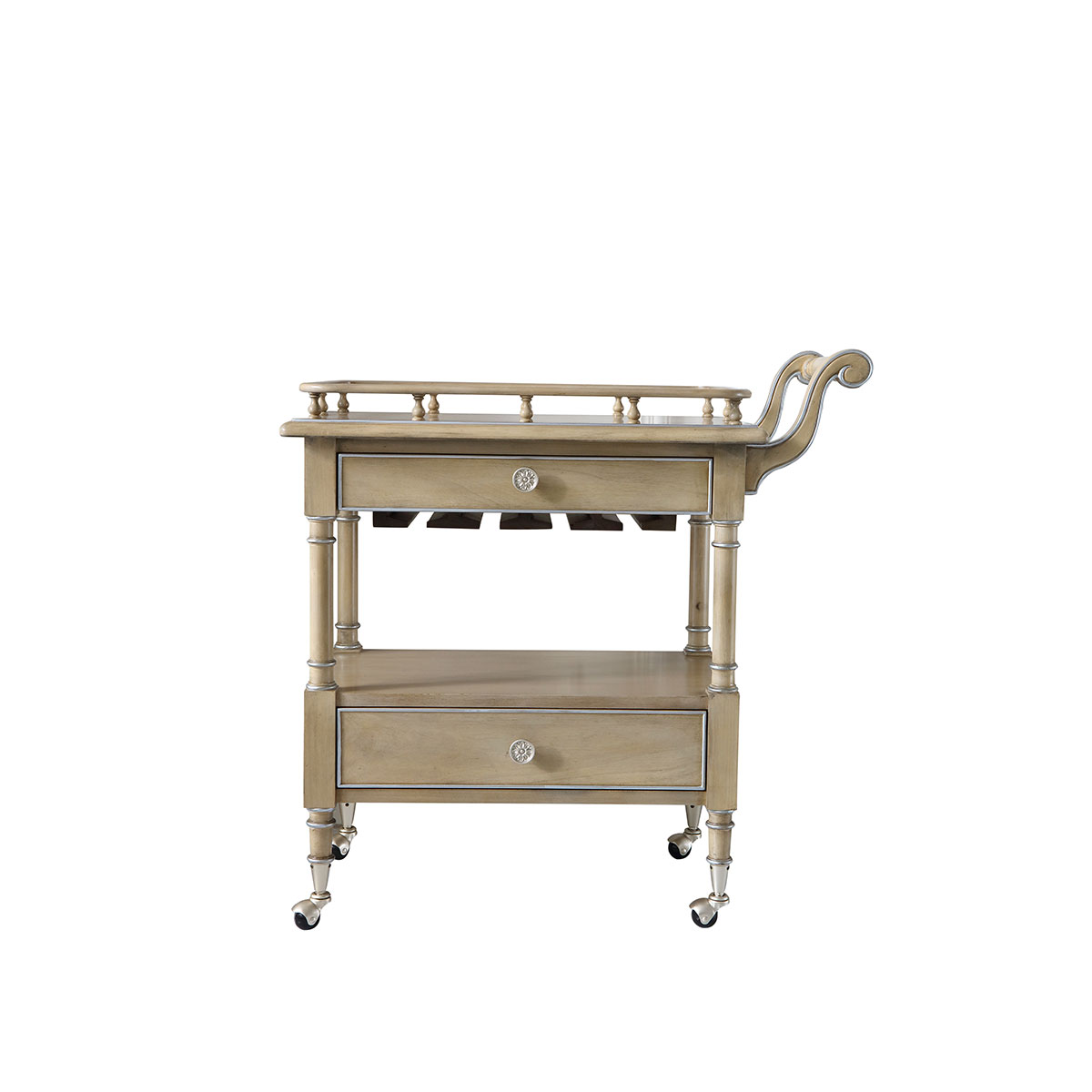 * 二个储物抽斗,底部采用经典的硬木实木滑轨 * 顶上有护边带推手,底下带脚轮,中间带挂酒杯的木制瓶架。