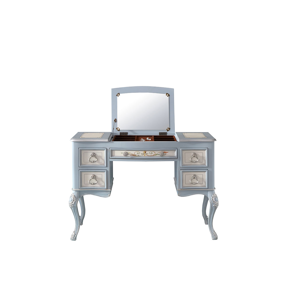 * 四个储物抽斗,底部采用硬木实木滑轨.中间抽斗的设计可翻下斗面,用来放置键盘,抽斗内侧有电线孔,抽斗两边装有两条三节消声铁滑轨,滑顺耐用; * 中间面板可打开,里面有镜子和绒布戒指格; * 脚底部装有可调脚钉