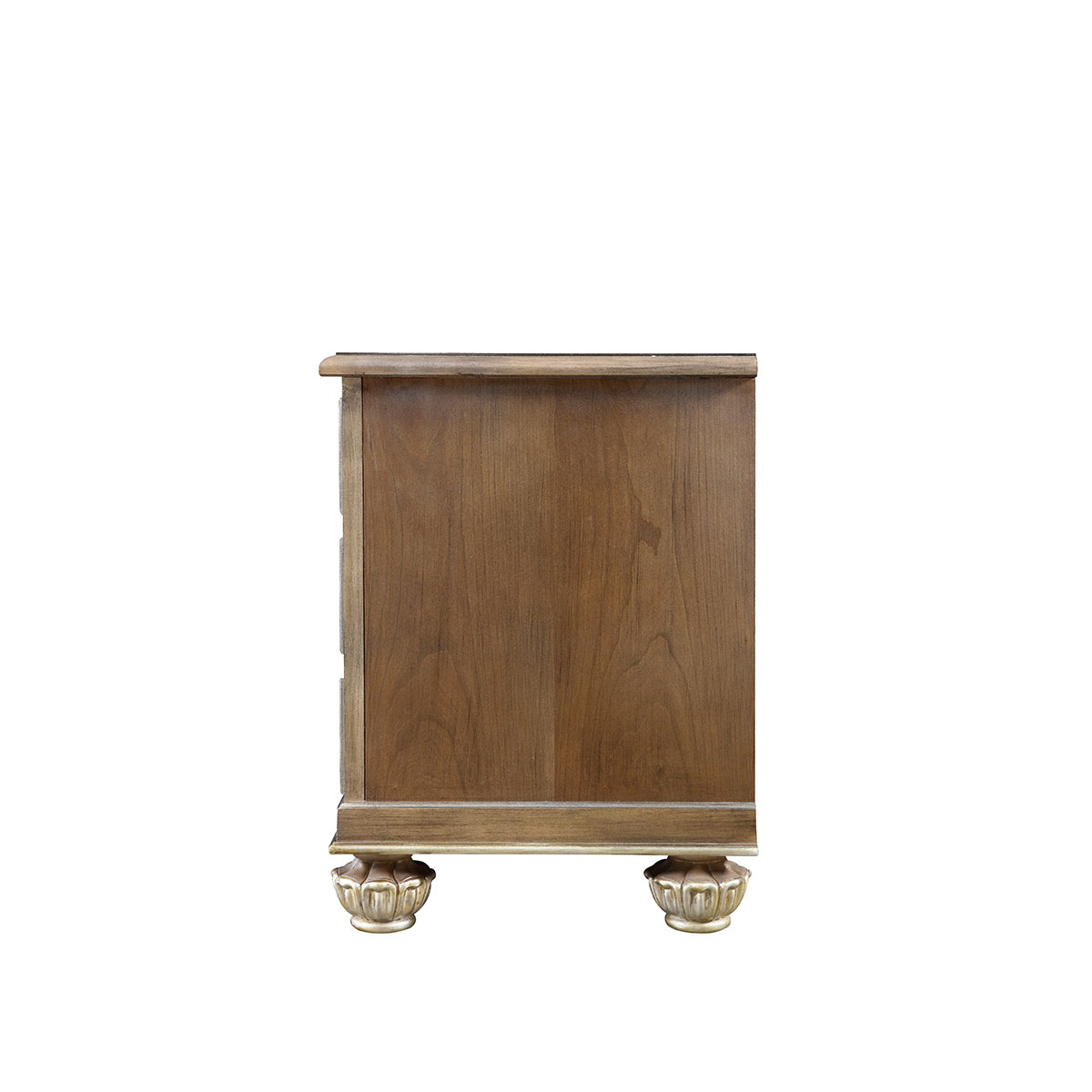 * 手工拼花藤蔓效果,用多种上等木皮拼制而成 * 三个储物斗,底部采用经典的硬木实木滑轨; * 脚脚底部装有可调脚钉;