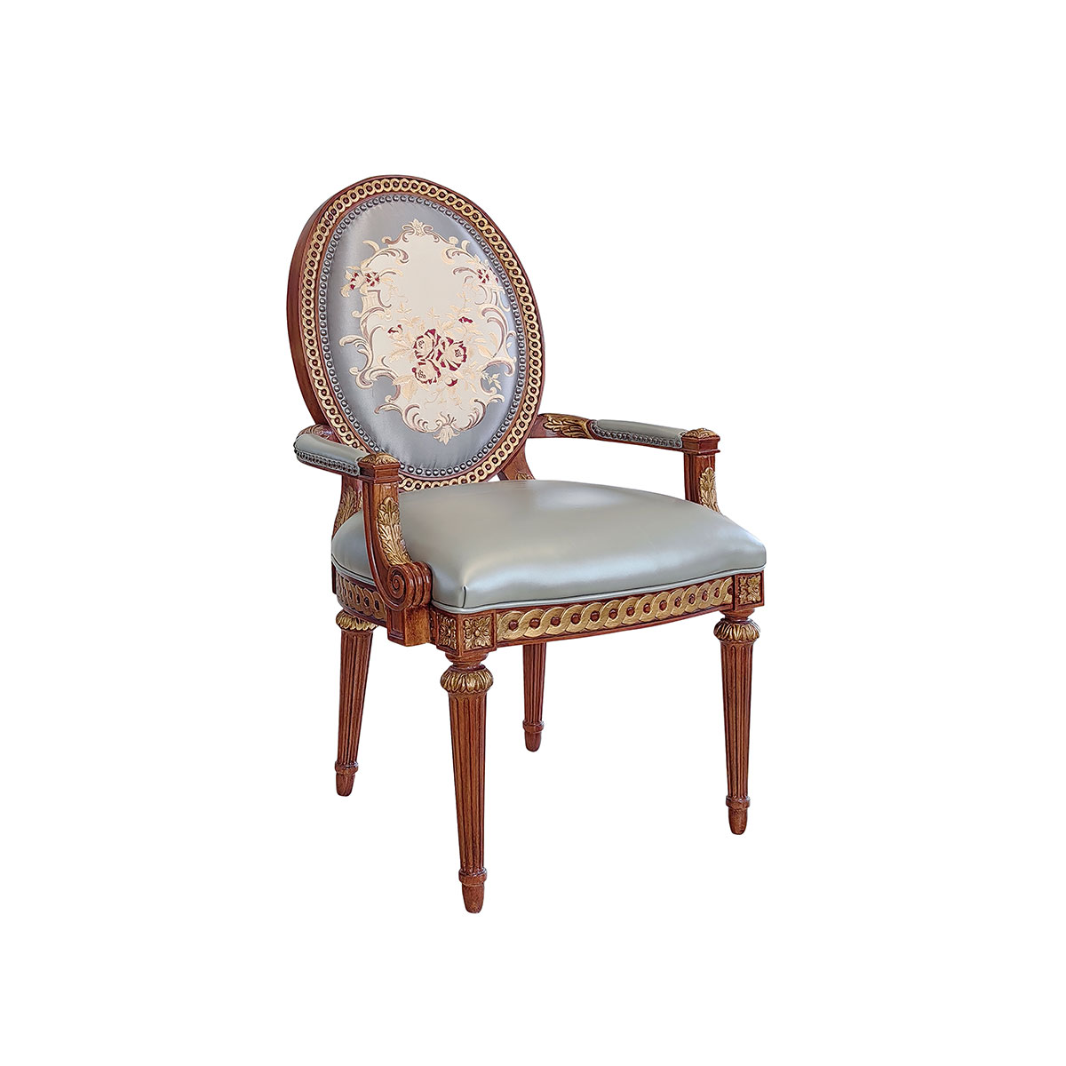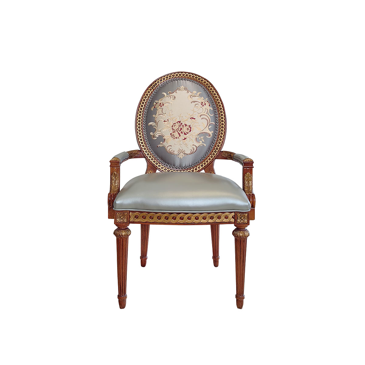 参考18世纪法国路易十六时期涂金扶手椅古董设计,并结合同时期的圆面背板设计。配上精致的连续雕刻和贴金铂工艺、锥形脚设计、触感舒适的布艺和包有丰厚的填充物坐垫和靠背。