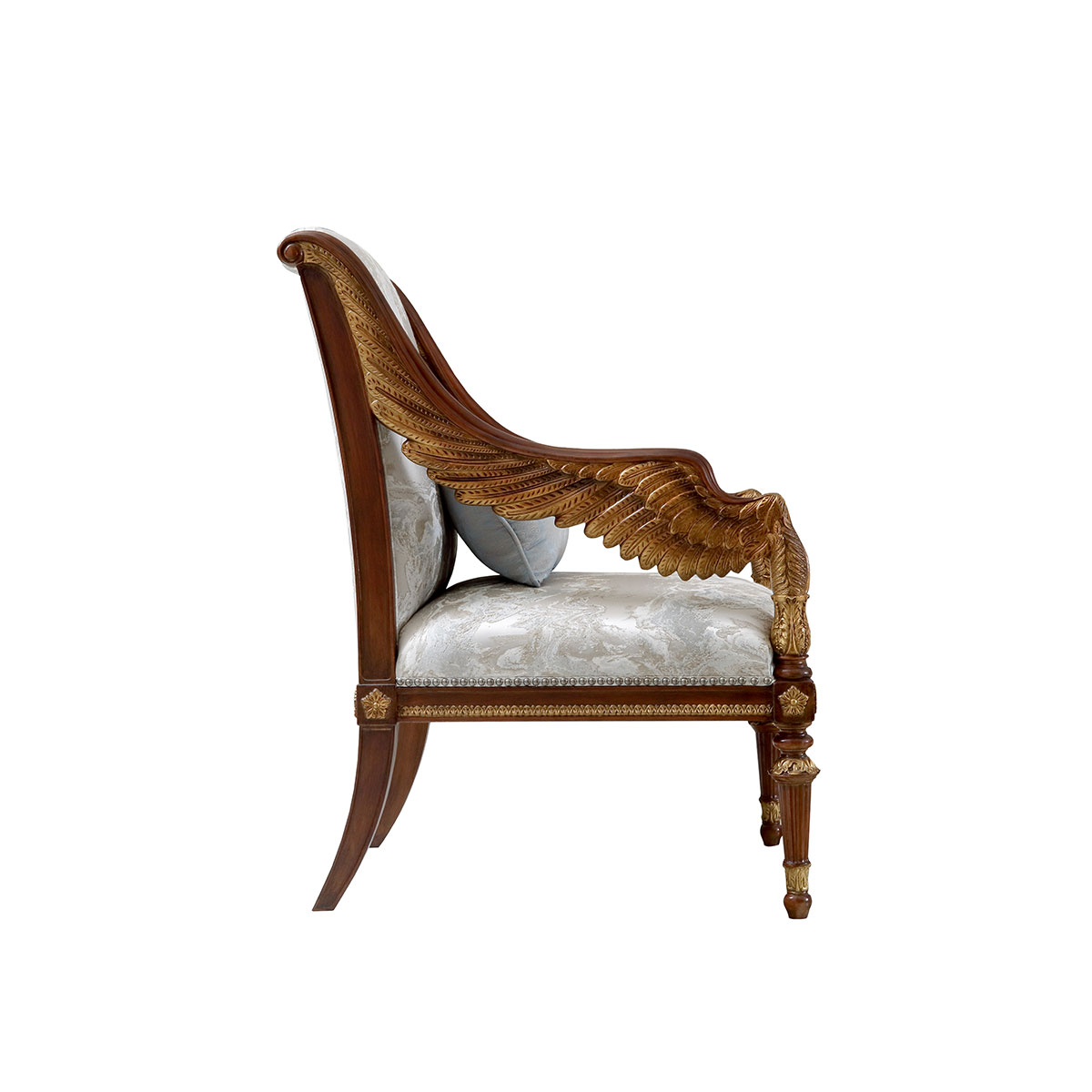 以现保存在法国"卢浮宫"的 “胜利女神像”为意念,并结合意大利强调帝权象征的帝国EMPIRE风格元素中翅膀造型,设计雕刻出胜利女神-Samothrace翅膀扶手,羽翼丰满的羽毛雕刻极为精巧经典,栩栩如生,复兴你的典雅情怀。