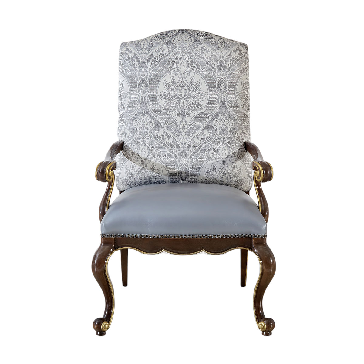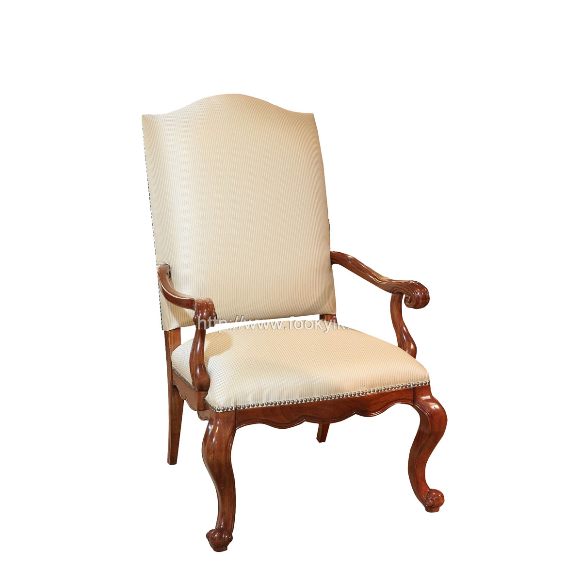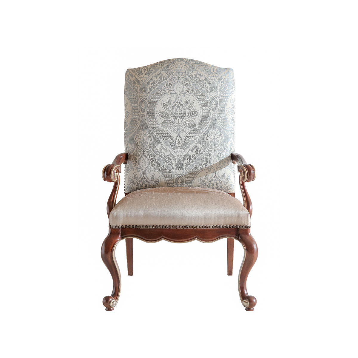 一款集合法式元素包括Camelback Silhouette(驼峰轮廓)造型、旋涡形扶手和S形弯脚的高背休闲椅,并配上触感舒适的布艺和包有丰厚的填充物坐垫和靠背。
