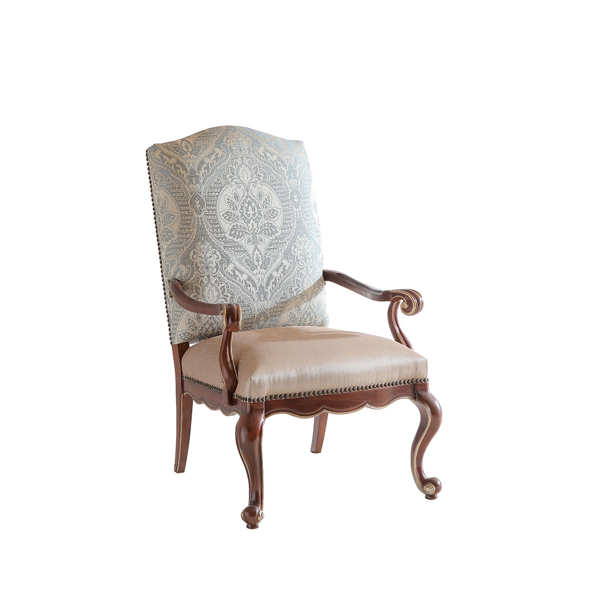一款集合法式元素包括Camelback Silhouette(驼峰轮廓)造型、旋涡形扶手和S形弯脚的高背休闲椅,并配上触感舒适的布艺和包有丰厚的填充物坐垫和靠背。