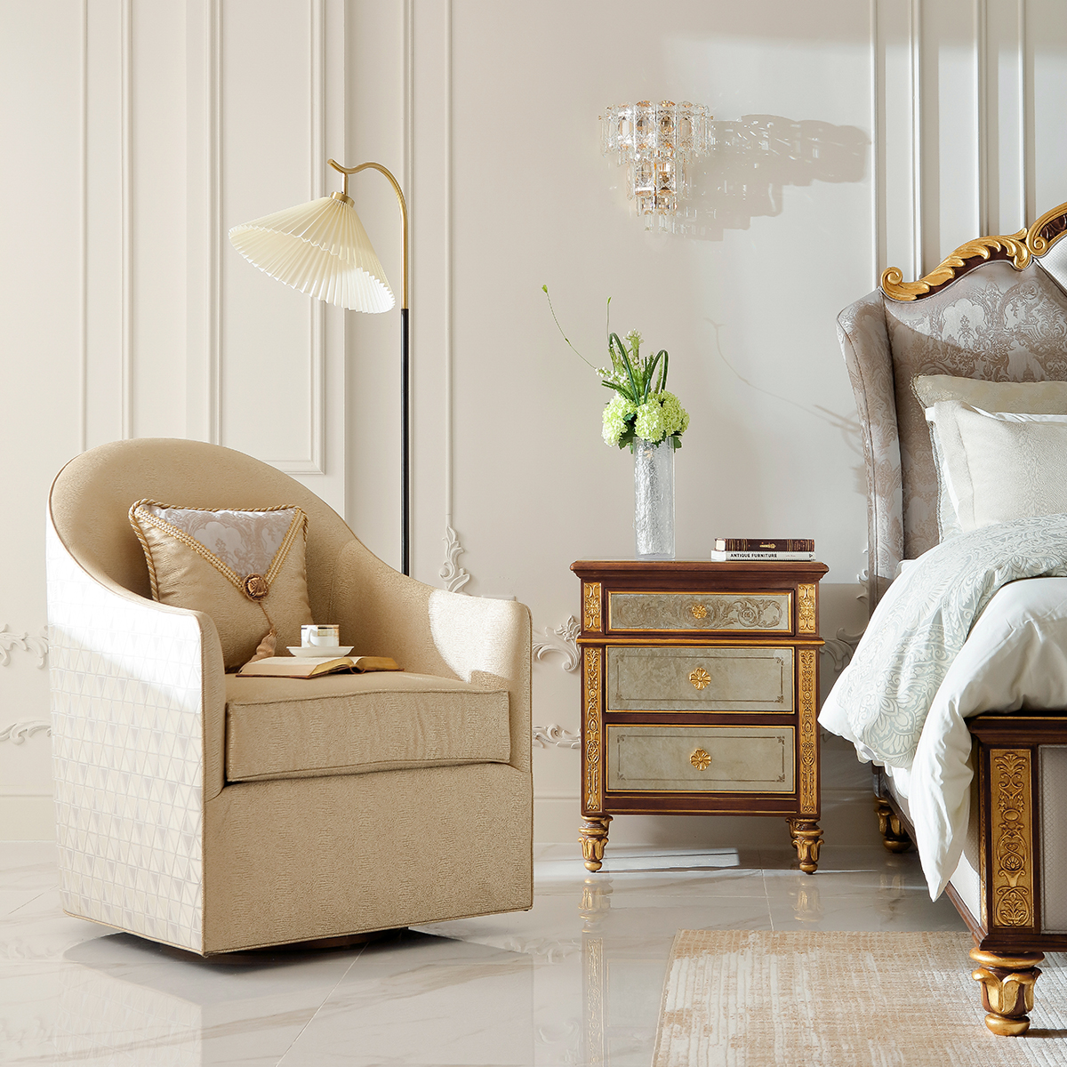 橡胶木+环保人造板+黑胡桃+艳阳花+樱桃木等木皮贴面+艺术玻璃