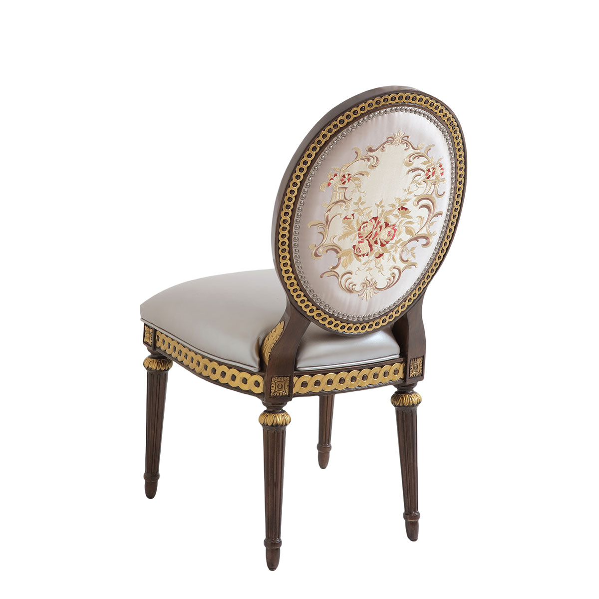 参考18世纪法国路易十六时期涂金扶手椅古董设计,并结合同时期的圆面背板设计。配上精致的连续雕刻和贴金铂工艺、锥形脚设计、触感舒适的布艺和包有丰厚的填充物坐垫和靠背。