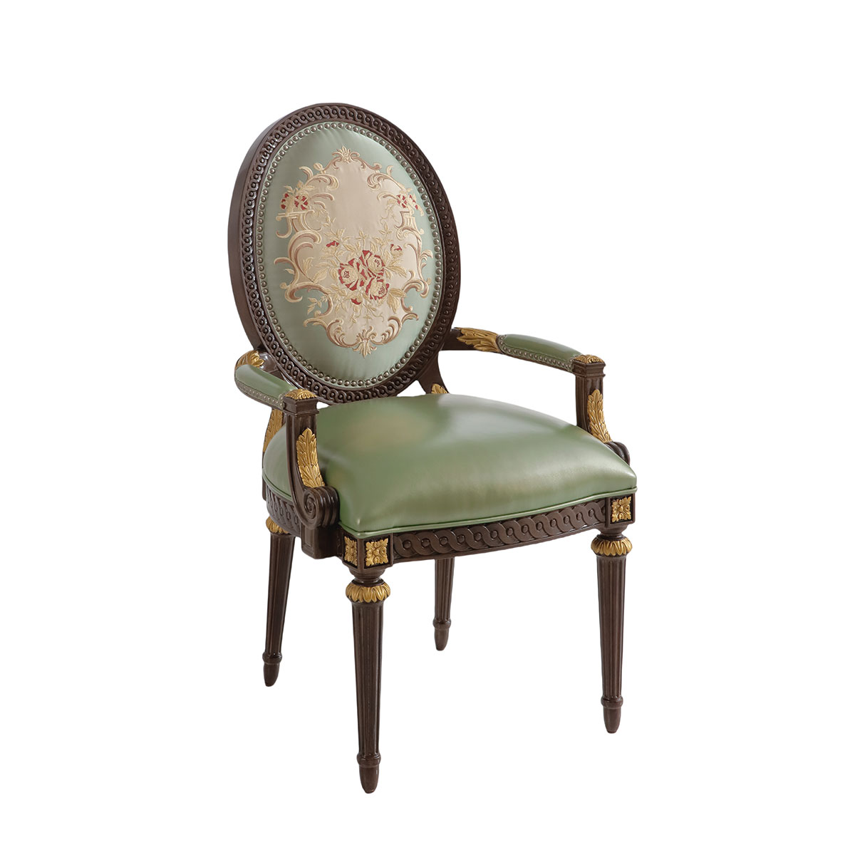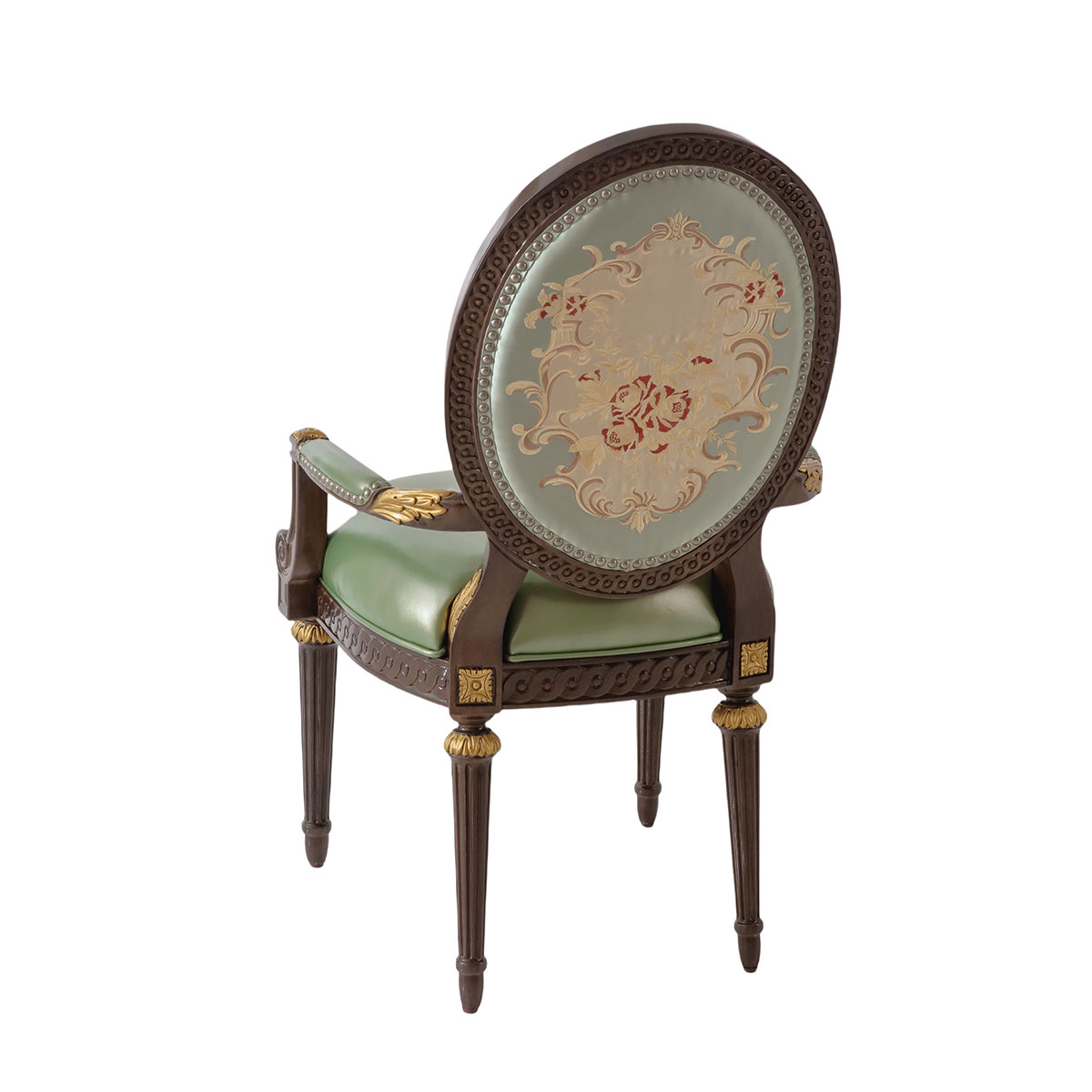参考18世纪法国路易十六时期涂金扶手椅古董设计,并结合同时期的圆面背板设计。配上精致的连续雕刻和贴金铂工艺、锥形脚设计、触感舒适的布艺和包有丰厚的填充物坐垫和靠背。