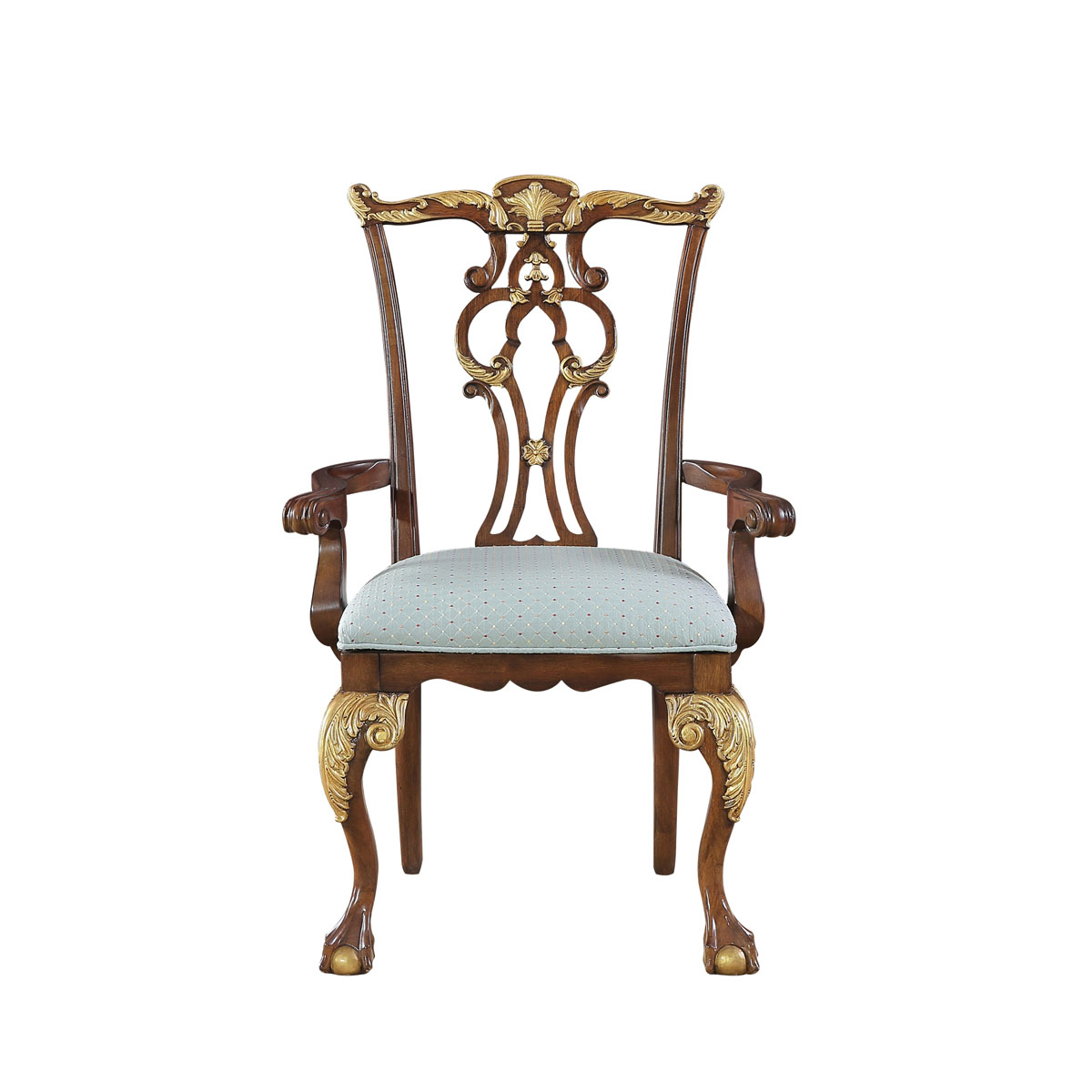 * 为表现英国皇室的华丽和庄严,以英国温莎堡为设计元素。从青花瓷花瓶得到灵感的Chippendale(齐彭代尔式)镂空椅背和与卷叶雕刻结合的兽抓球弯腿设计,表达出王室的尊贵品位。配上精致的手工雕刻细节和贴金箔工艺,是豪华系列温莎堡英式扶手椅的特色。