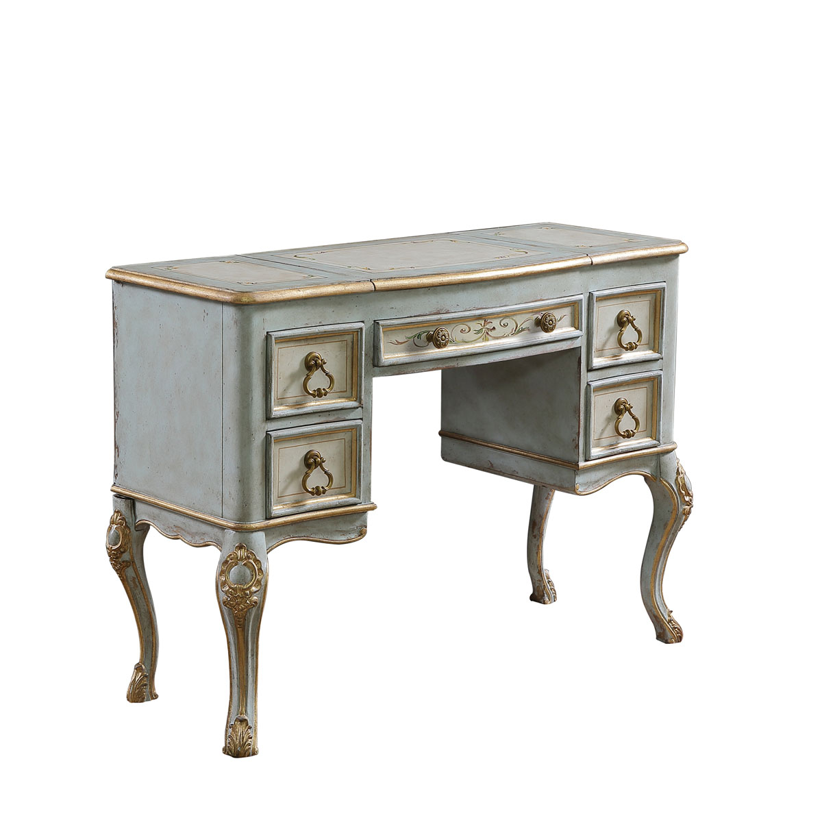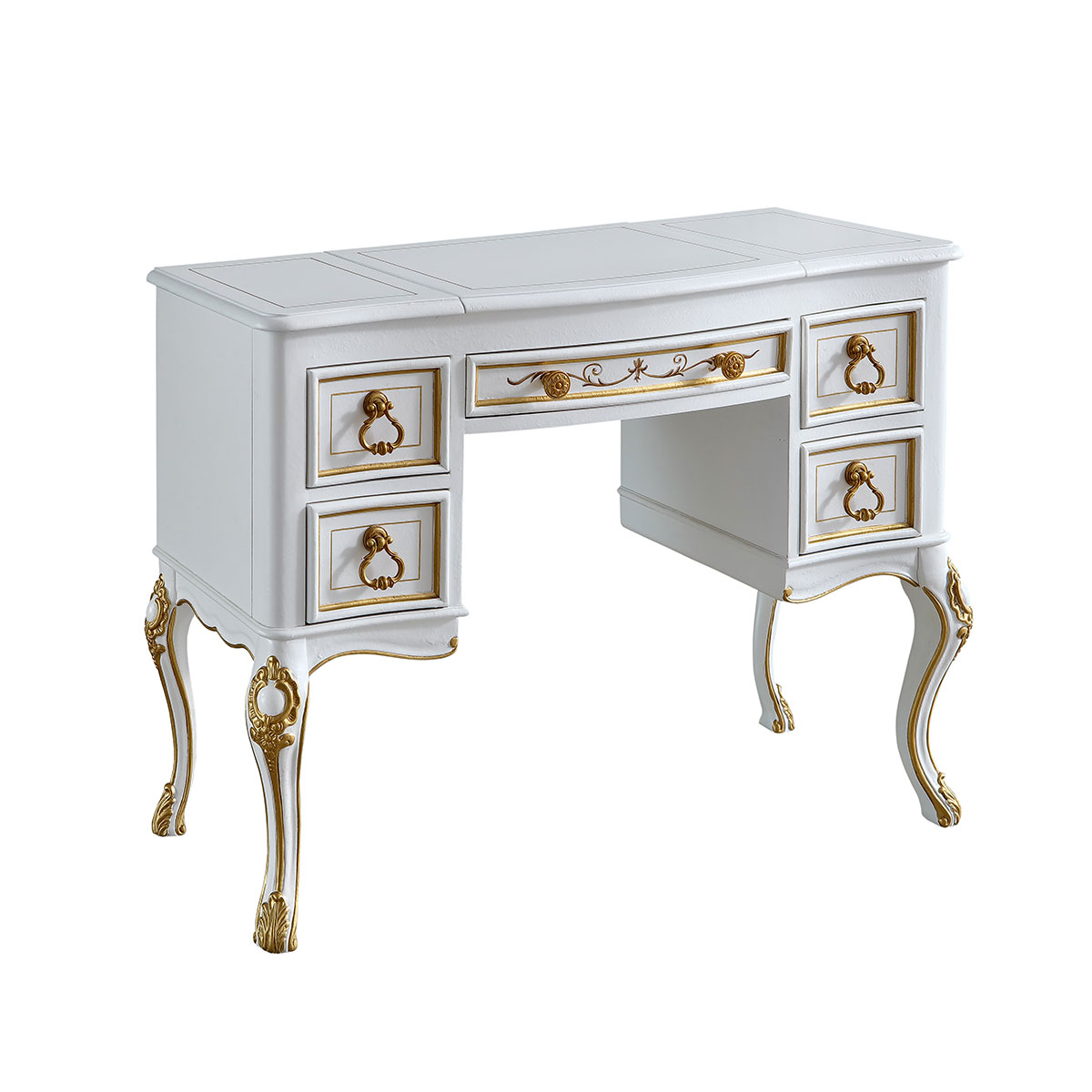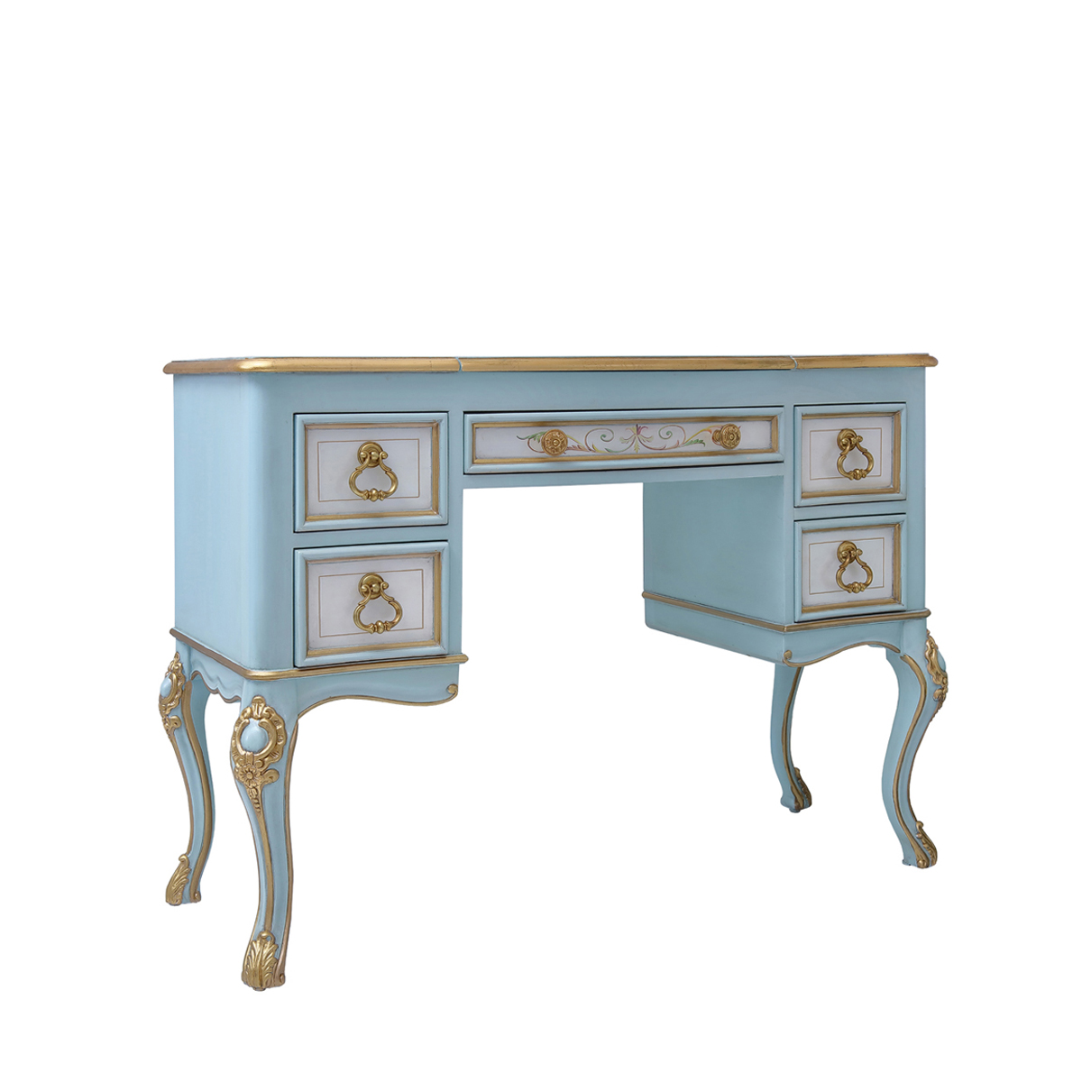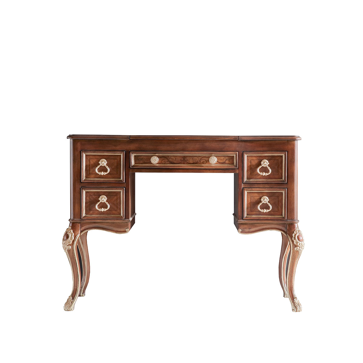 * 四个储物抽斗,底部采用硬木实木滑轨.中间抽斗的设计可翻下斗面,用来放置键盘,抽斗内侧有电线孔,抽斗两边装有两条三节消声铁滑轨,滑顺耐用; * 中间面板可打开,里面有镜子和绒布戒指格; * 脚底部装有可调脚钉