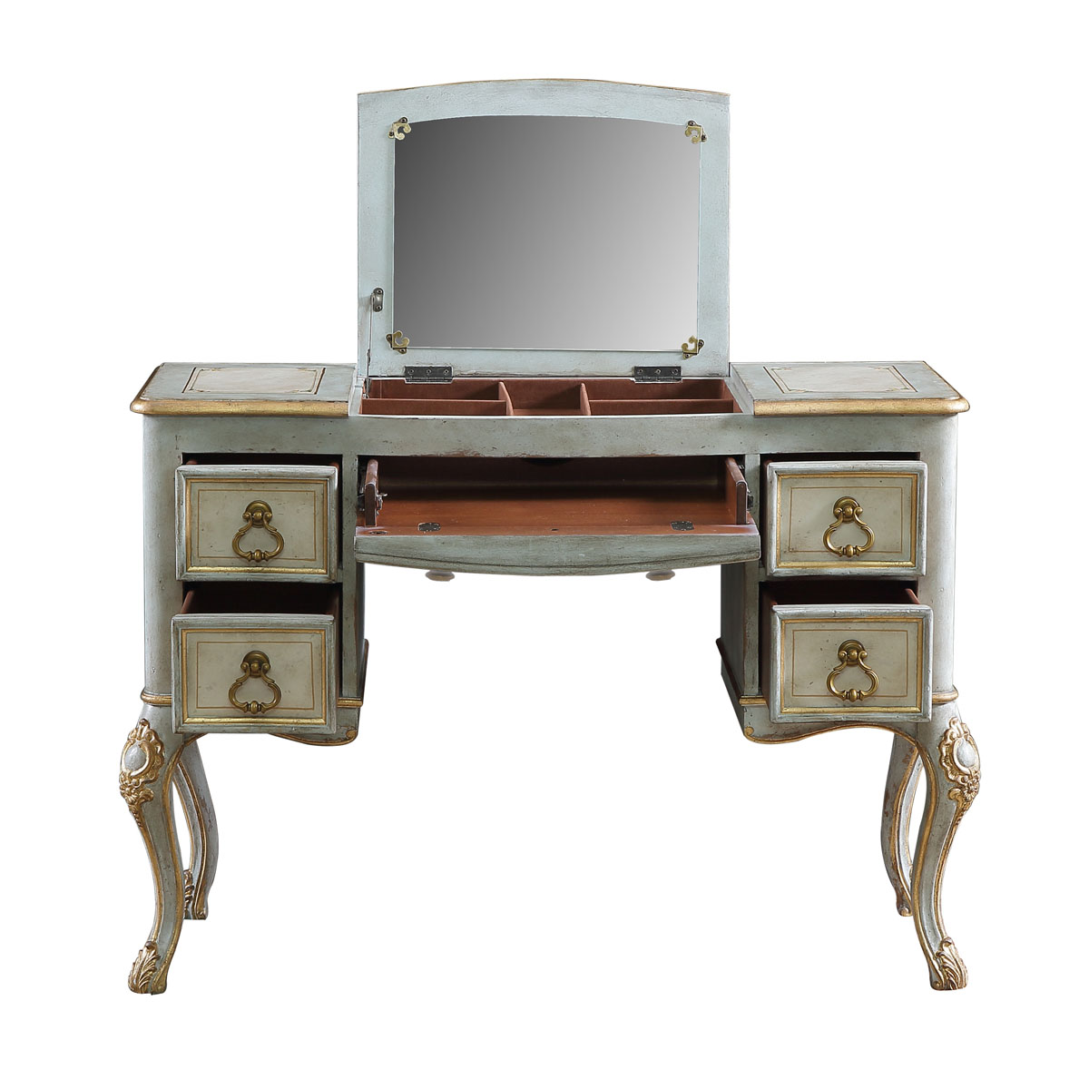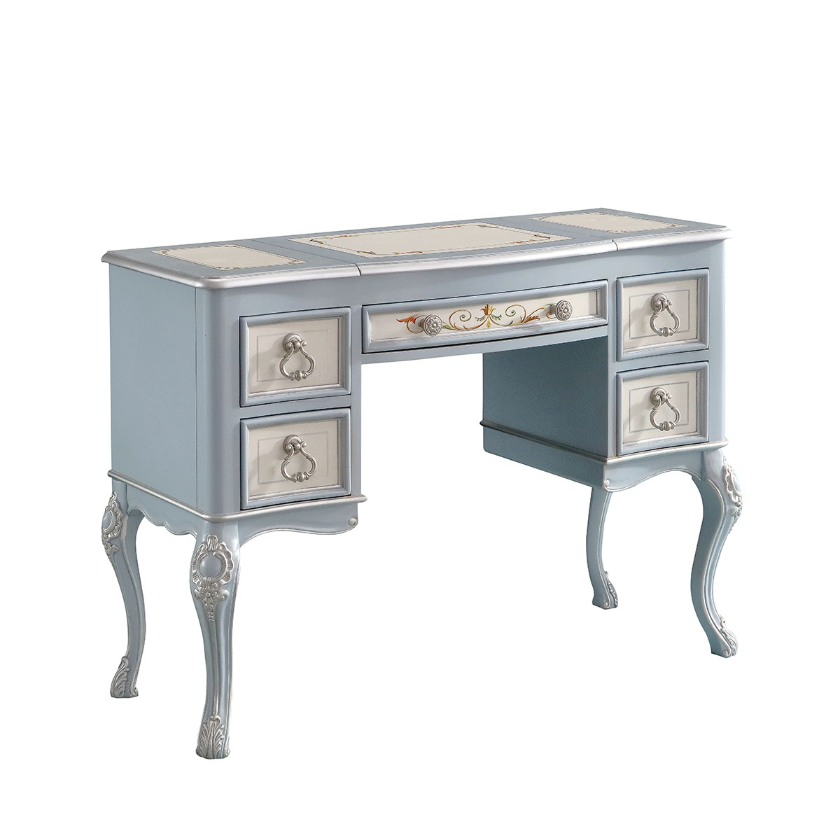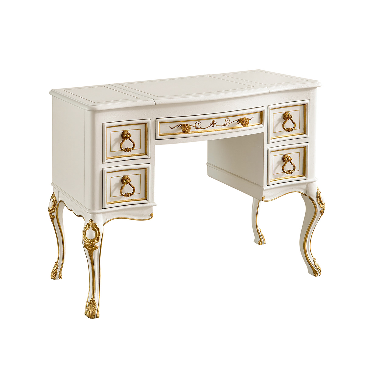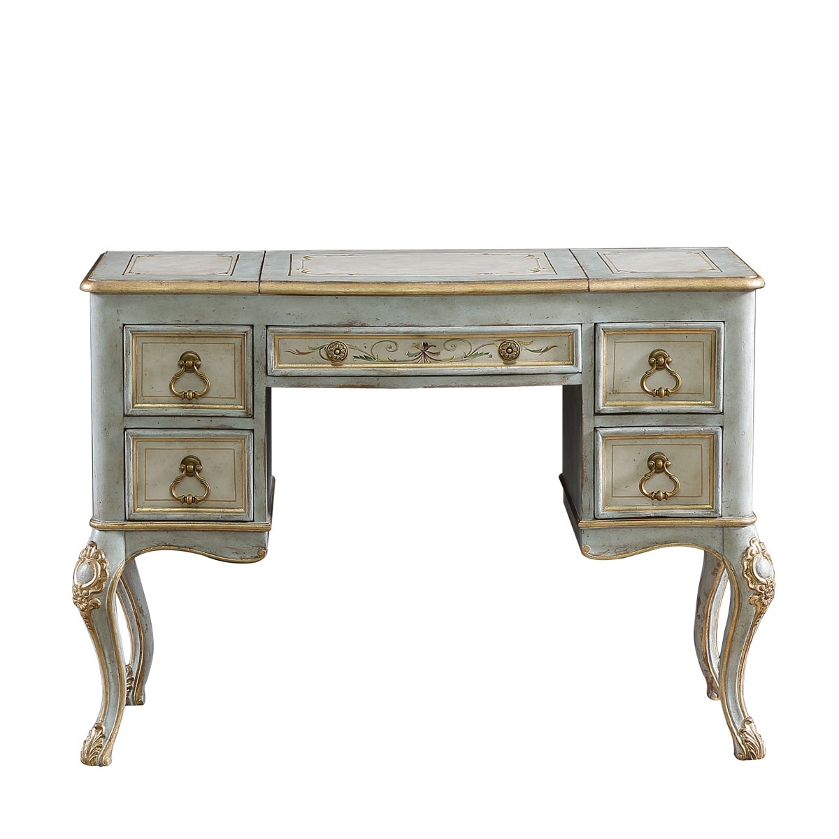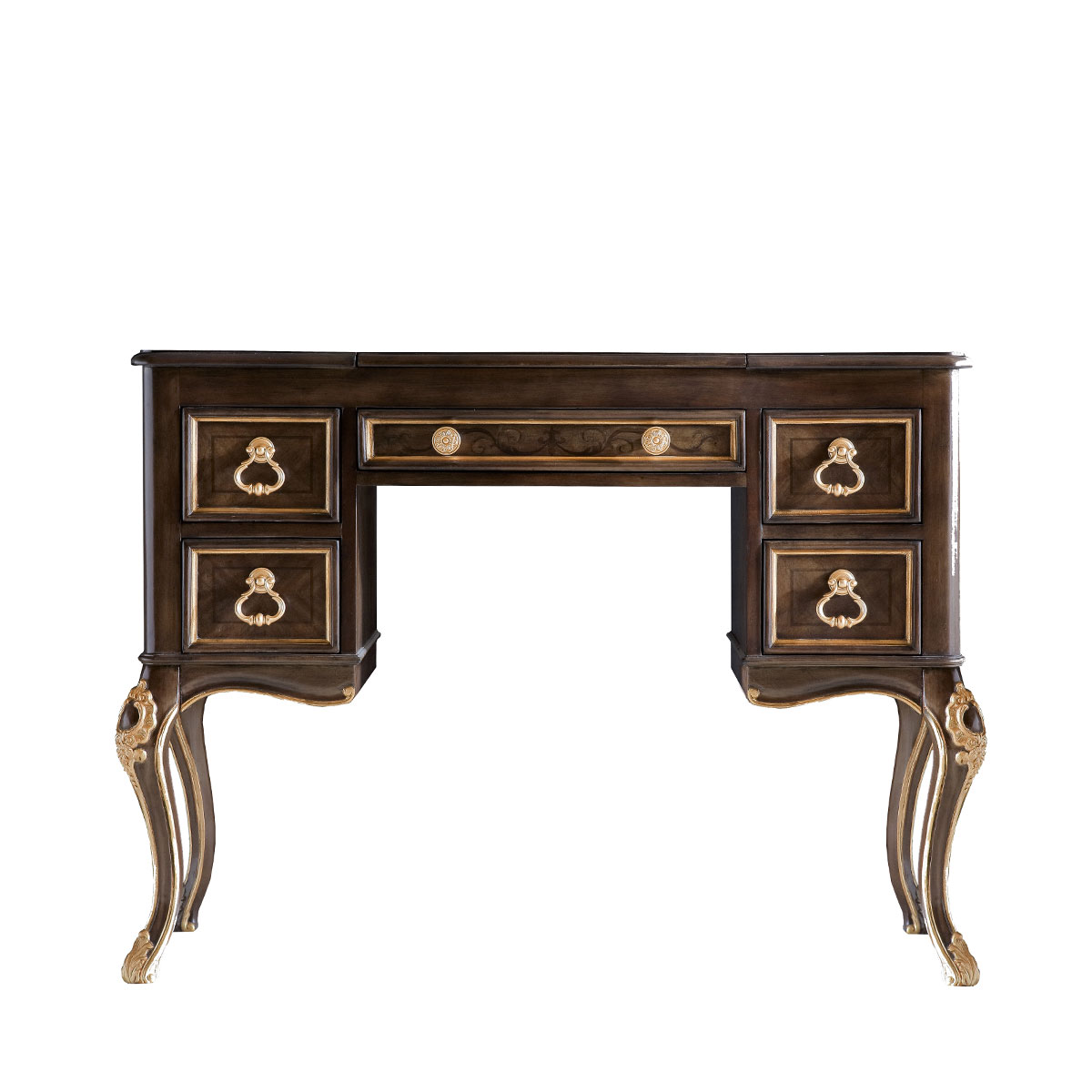* 四个储物抽斗,底部采用硬木实木滑轨.中间抽斗的设计可翻下斗面,用来放置键盘,抽斗内侧有电线孔,抽斗两边装有两条三节消声铁滑轨,滑顺耐用; * 中间面板可打开,里面有镜子和绒布戒指格; * 脚底部装有可调脚钉