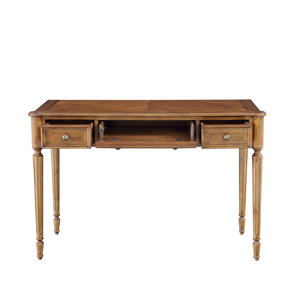 * 共三个大小不同的储物抽斗,中斗为翻斗,左右两边为储物抽斗; * 抽斗内侧有电线孔,抽斗两边装有两条三节消声铁滑轨,滑顺耐用; * 脚是可拆装的; * 脚底部装有可调脚钉;