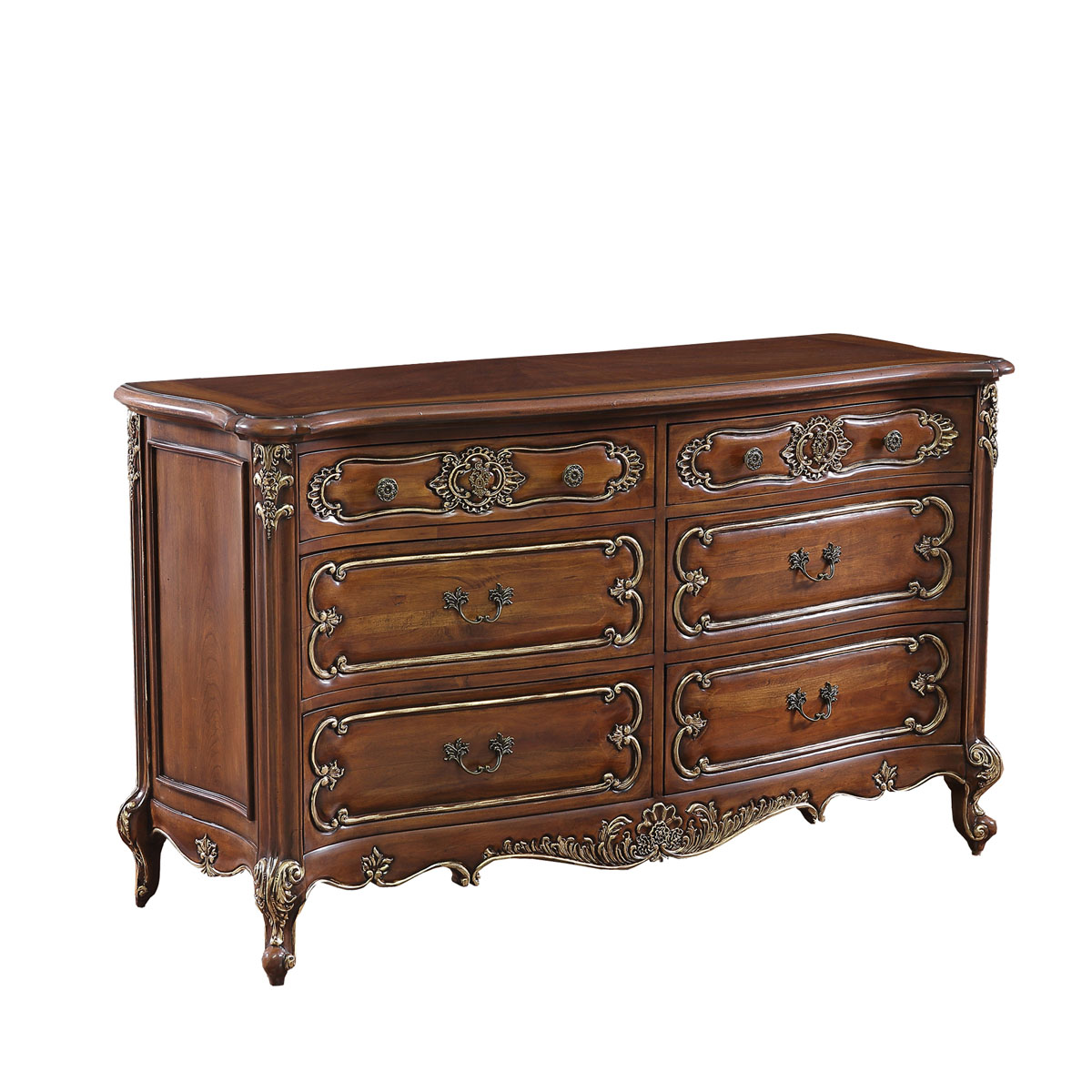 * 手工雕刻的花圃、藤蔓、阿坎瑟斯卷叶图案和弯脚设计; * 结实的连接技术; * 6个储物抽斗,右上斗为翻斗,内可置放电子器材,其底部采用经典硬木实木滑轨设计; * 脚底部装有可调脚钉;