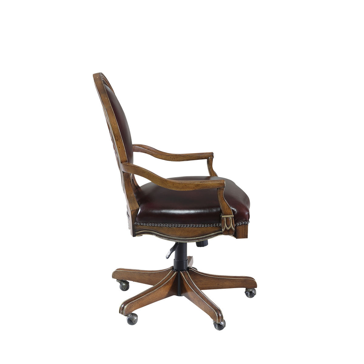参考18世纪法国路易十六时期涂金扶手椅古董设计,并结合同时期的圆面背板设计。配上精致的仿古青铜钉、细腻的牛皮和描金工艺,可调节高度的坐垫、优美的扶手线条和360度旋转的脚轮,全方位诠释凡尔赛玫瑰的奢华。