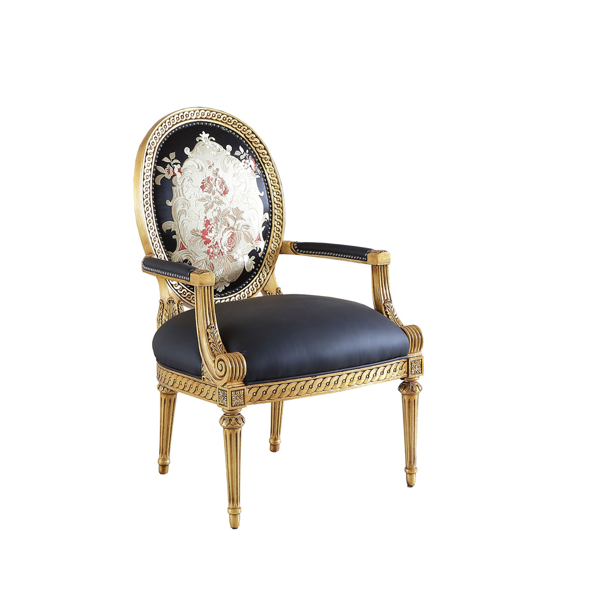 * 这款休闲椅是参考18世纪法国路易十六时期涂金扶手椅古董设计,并结合同时期的圆面背板设计。配上精致的连续雕刻和贴金铂工艺、锥形脚设计、触感舒适的布艺和包有丰厚的填充物坐垫和靠背。