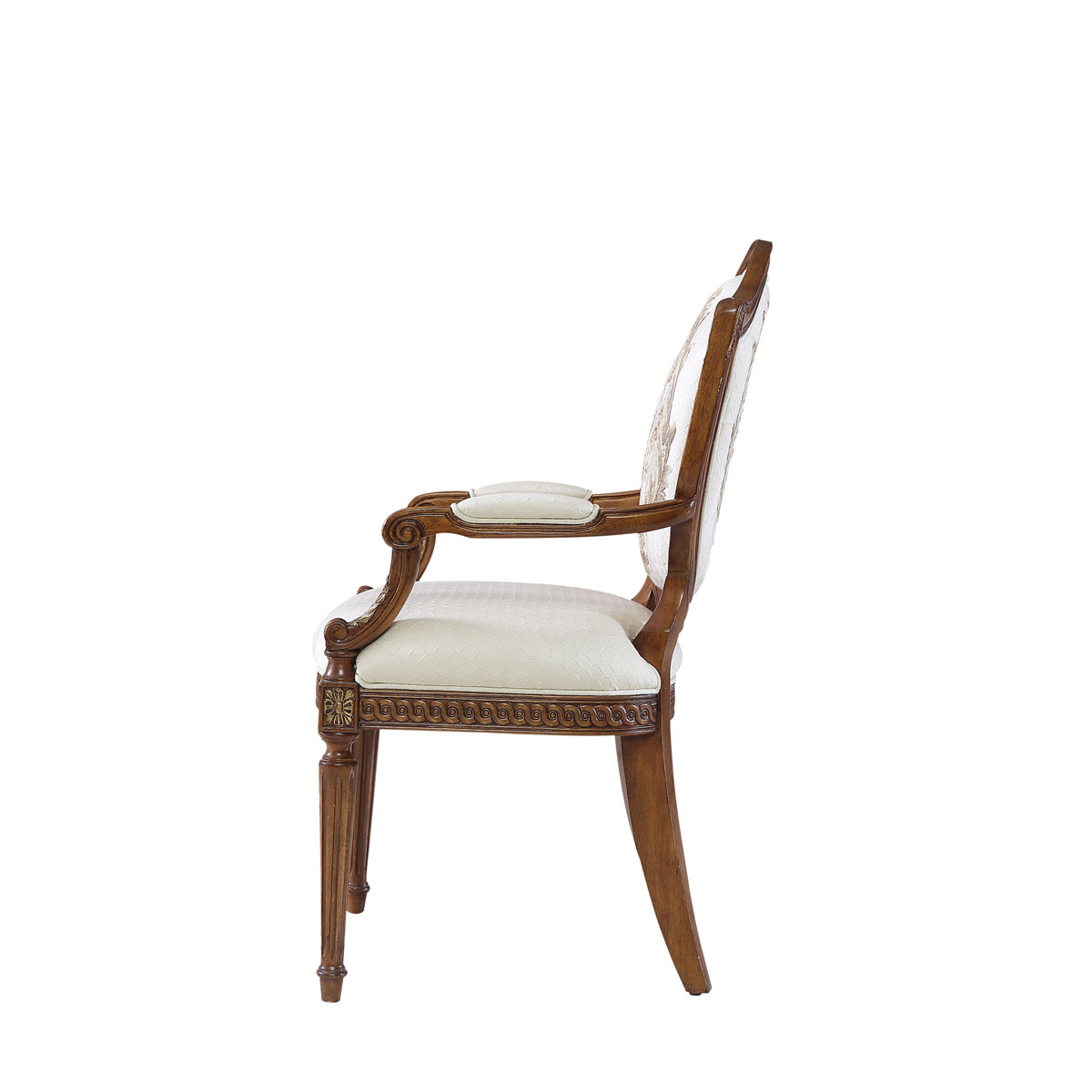 法国新古典和洛可可风格,盾型椅背造型简约大方,建筑柱雕刻柱腿简约的直线条造型,端庄大气,采用印花布艺,非常有田园风的感觉。