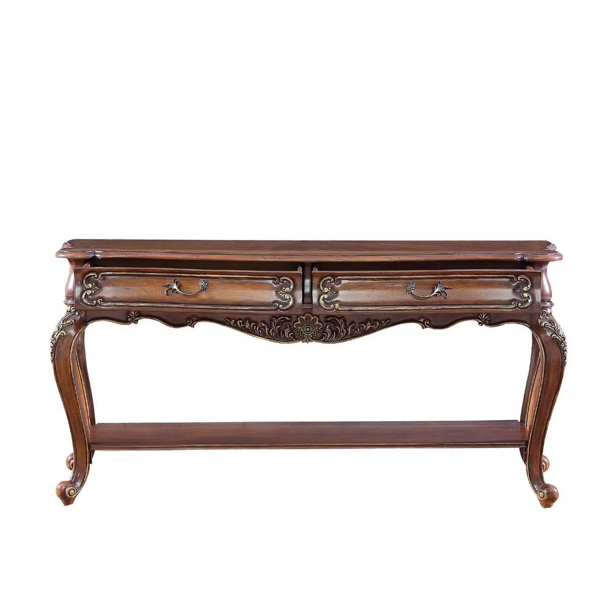 * 手工雕刻的藤蔓、阿坎瑟斯卷叶图案和弯脚设计; * 两个储物抽斗,其底部采用经典硬木实木滑轨设计; * 底部的层板可放置家庭装用品; * 底部装有可调整脚钉;