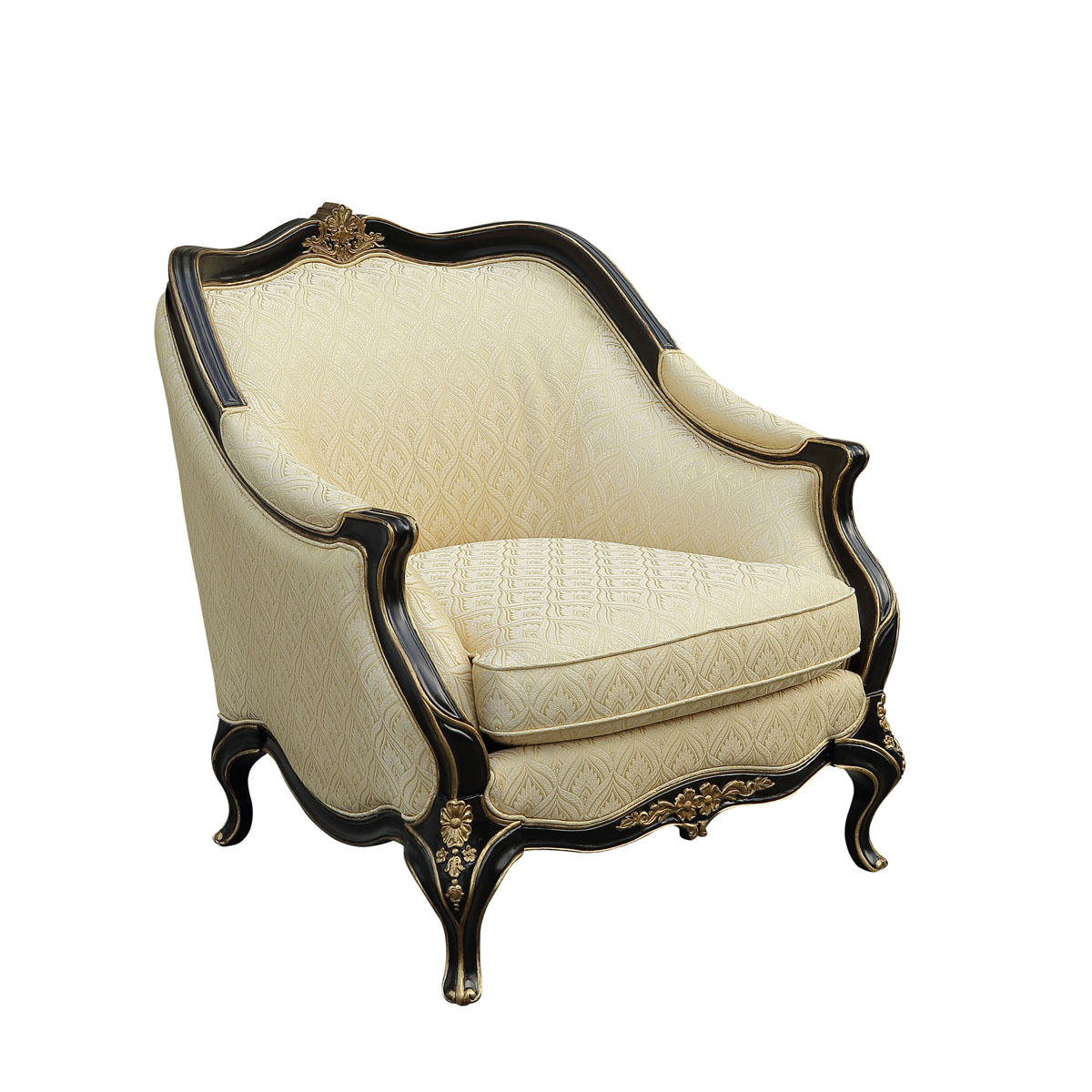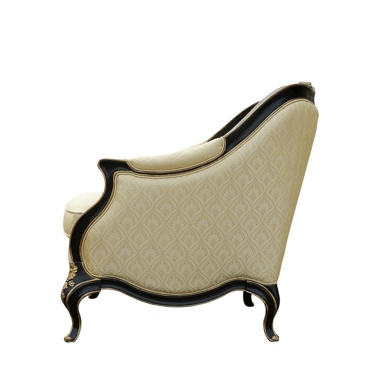 * 从法国十八世纪初摄政时期的风格中汲取灵感制作而成,采用了同风格的弯脚设计,阿坎瑟斯叶雕刻造型和金箔贴饰,再饰以中国山水图案的丝绸和包有丰厚的填充物坐垫和靠背,使得这款沙发闪耀着华丽高贵的光环。