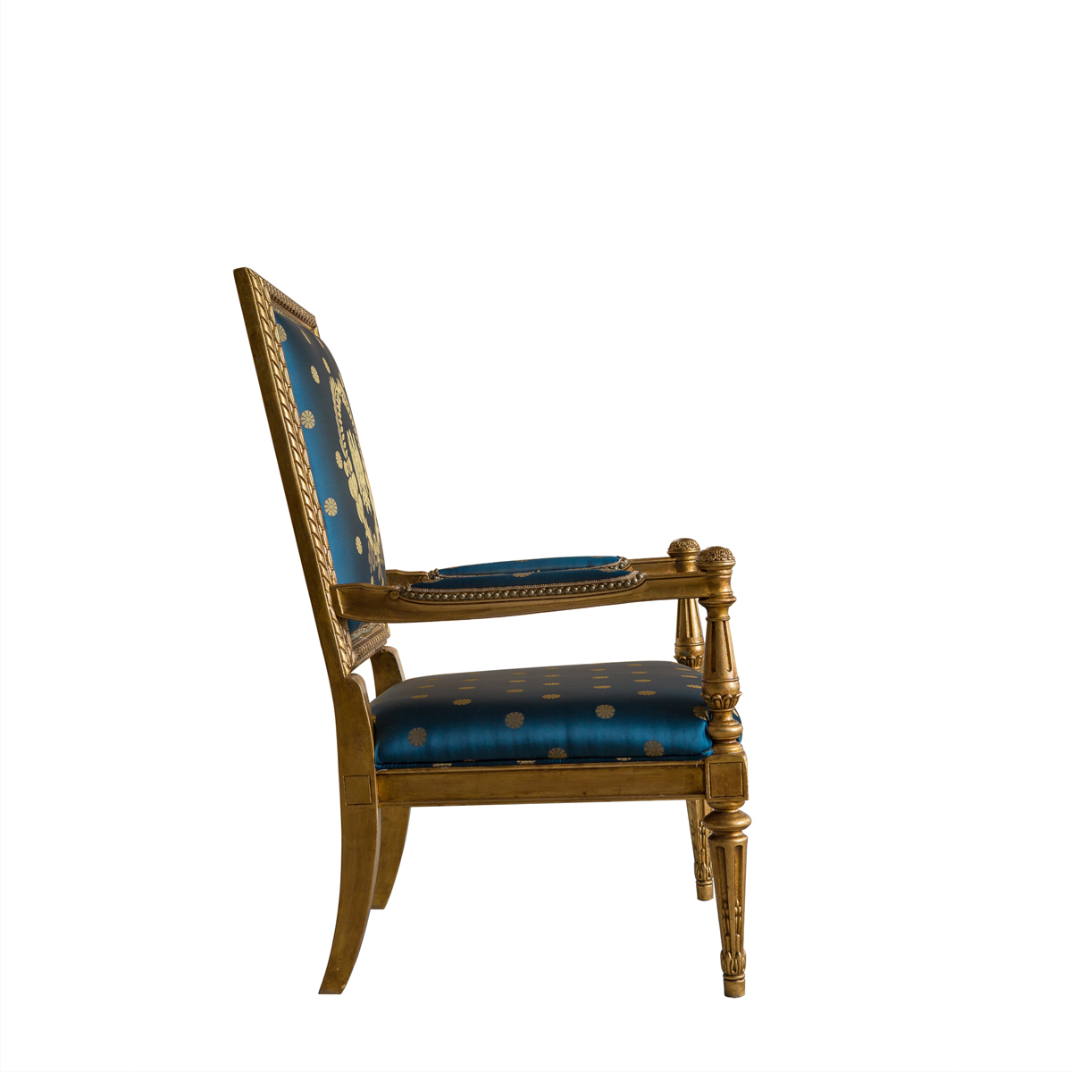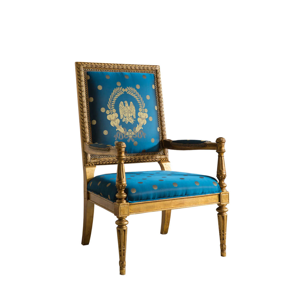 * 这是以美国白宫的Blue Room(蓝色房间) 为意念并结合法国元素而设计的沙发。包括建筑雕刻锥形脚、 权杖状的扶手柱、叶形雕刻外框和贴金铂工艺,配上代表自由的蓝色布艺和包有丰厚的填充物坐垫和靠背。