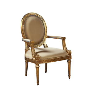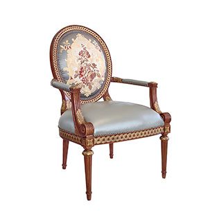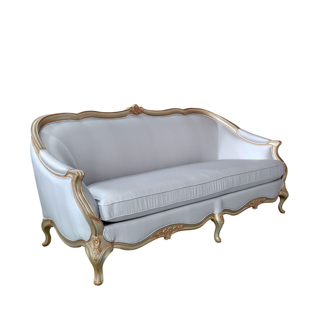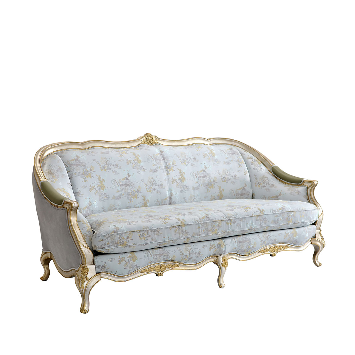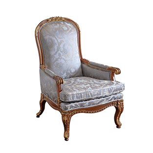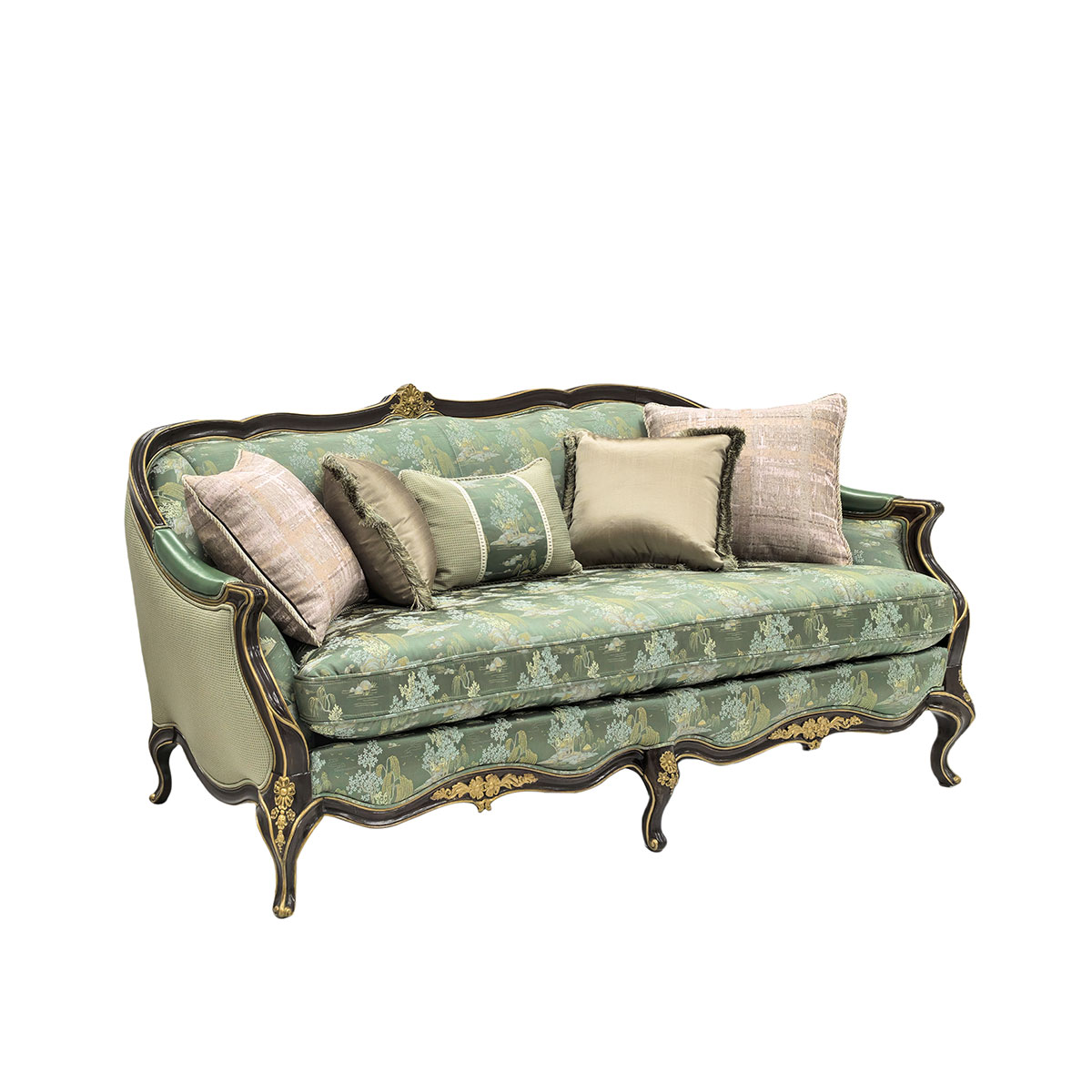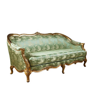 * 从法国十八世纪初摄政时期的风格中汲取灵感制作而成,采用了同风格的弯脚设计,阿坎瑟斯叶雕刻造型和金箔贴饰,再饰以中国山水图案的丝绸和包有丰厚的填充物坐垫和靠背,使得这款沙发闪耀着华丽高贵的光环;