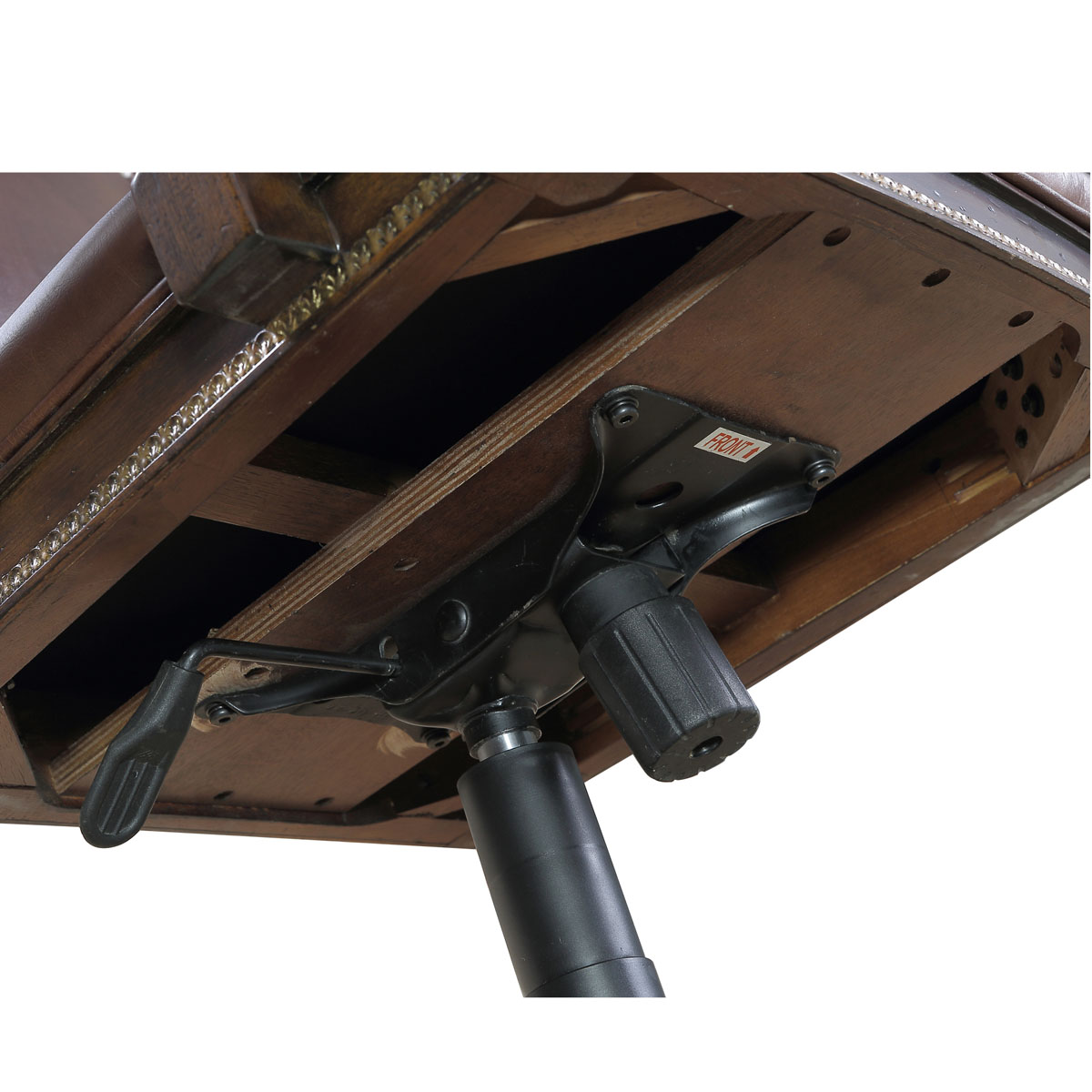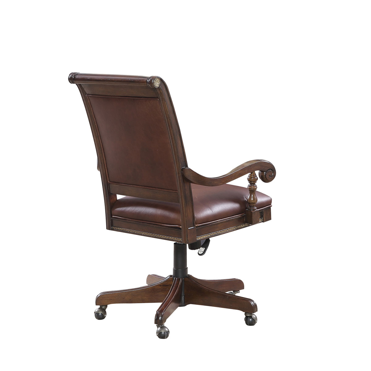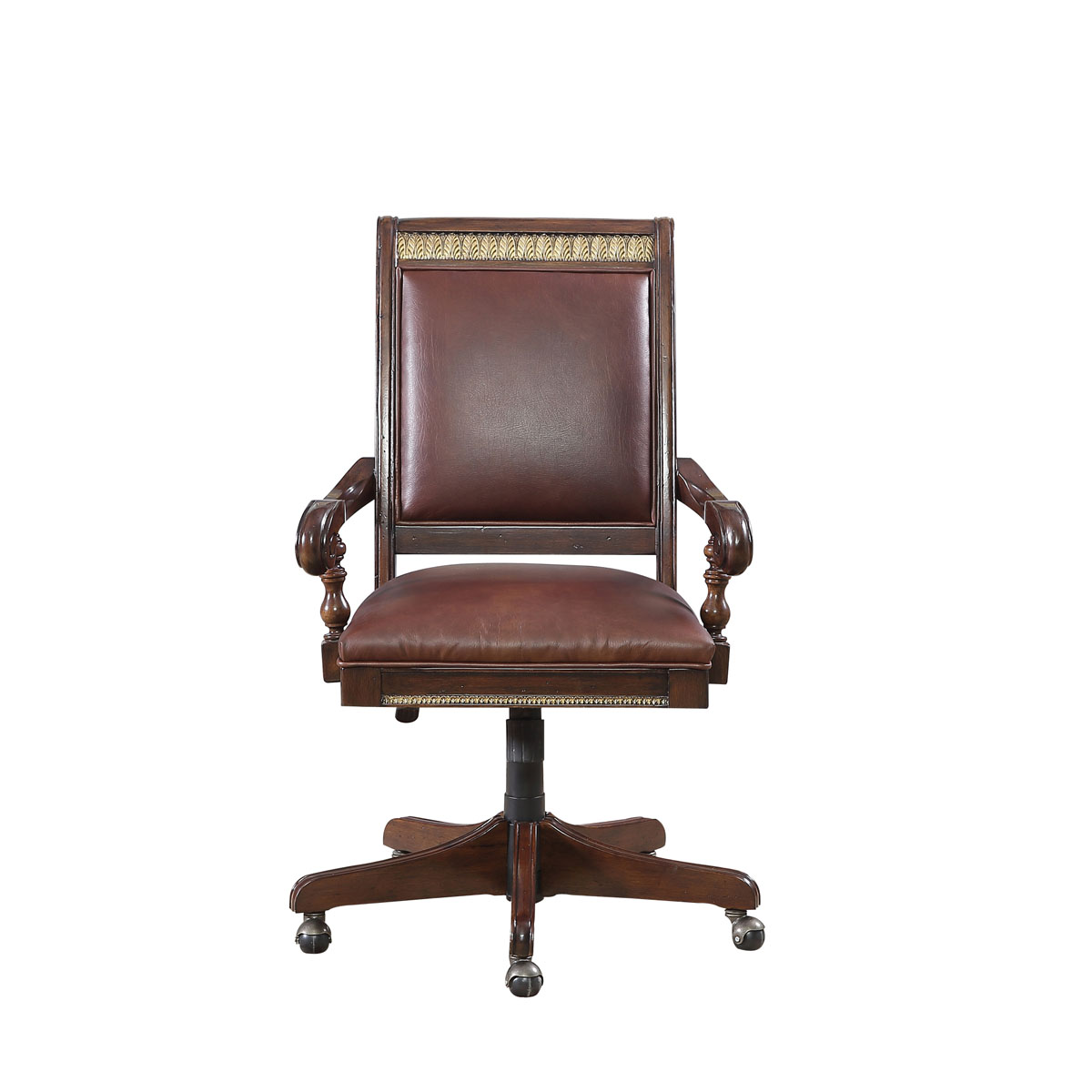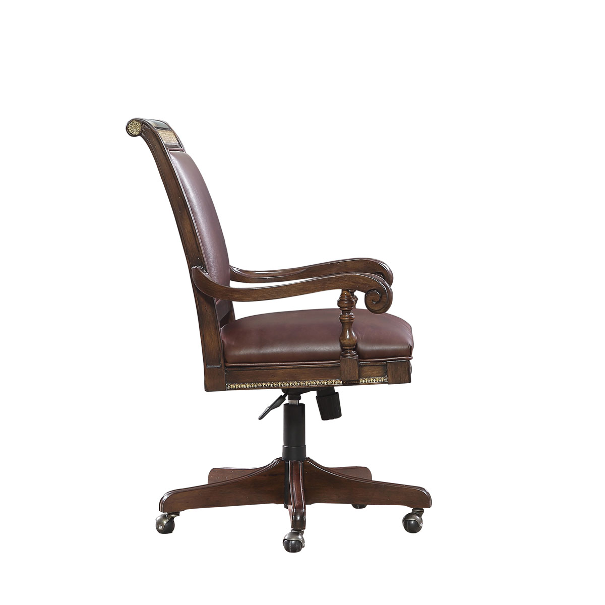 翡冷翠办公椅细腻的葡萄叶雕刻饰以描金工艺,是从意大利传承千年的葡萄酒文化中汲取的设计灵感;旋涡状的羊角扶手结合可调节高度的皮艺坐垫和360度旋转顺畅的脚轮,无疑为良好的办公环境加持。