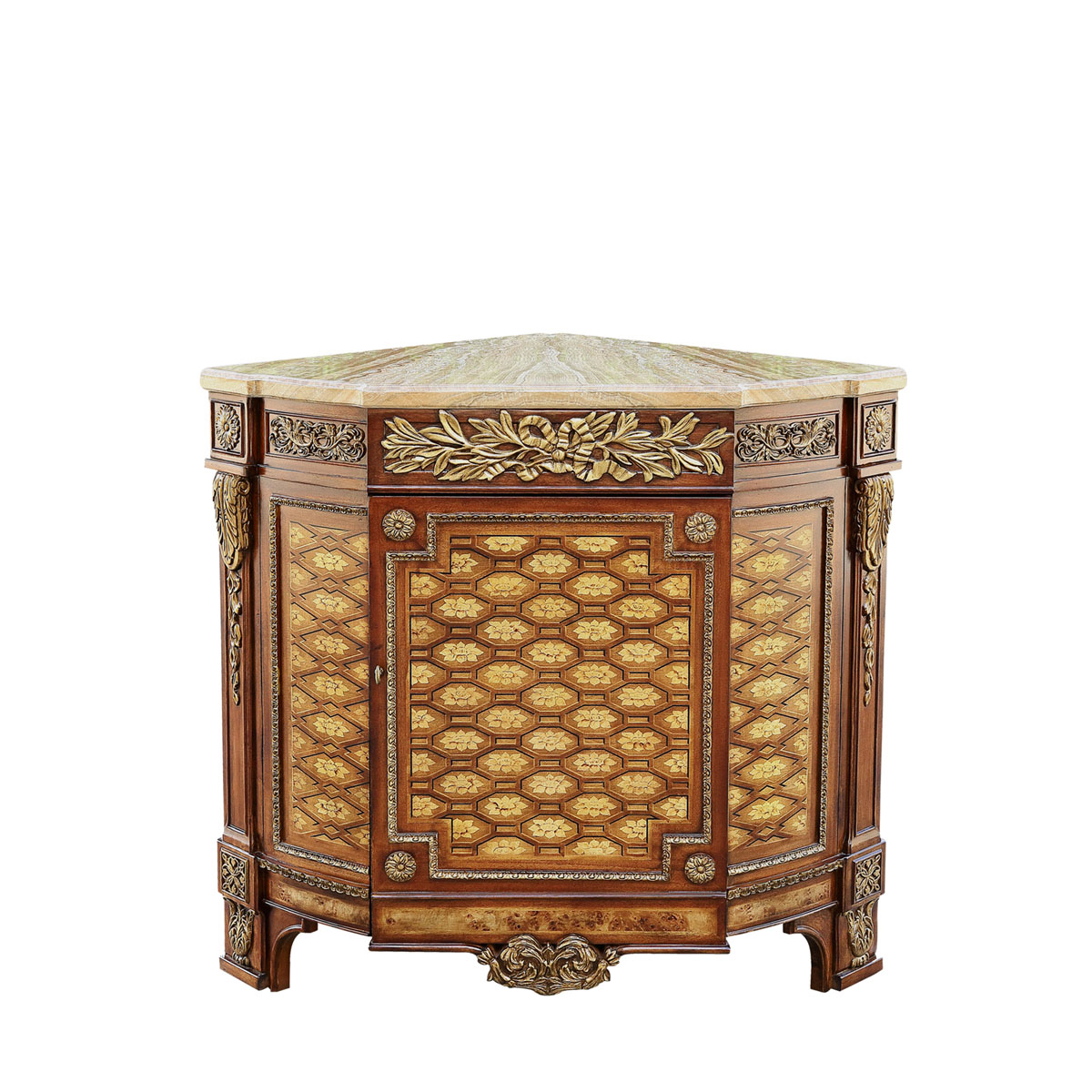 * 手工雕刻的工艺细节,结实的连接技术; * 光滑的花岗岩石表面; * 前方有1个储物抽斗,而在其底部采用经典硬木实木滑轨设计; * 门内一块实木可调层板; * 底部装有可调脚钉;