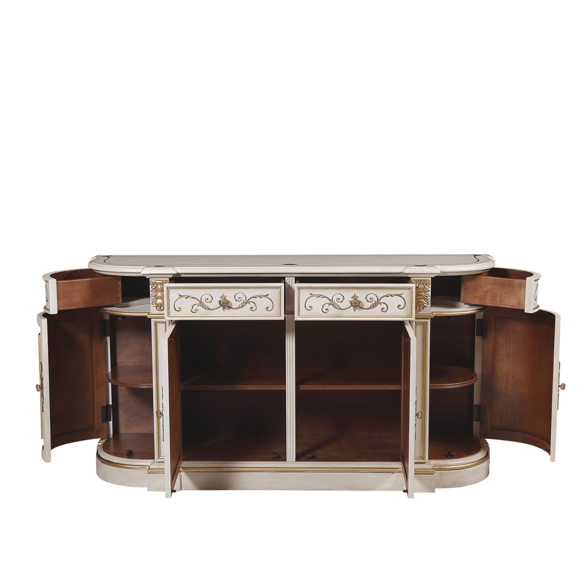 * 有四个储物功能抽斗 ,其底部采用硬木实木滑轨 * 四扇实木门板,门内带有-块活动层板; * 脚底部装有可调脚钉